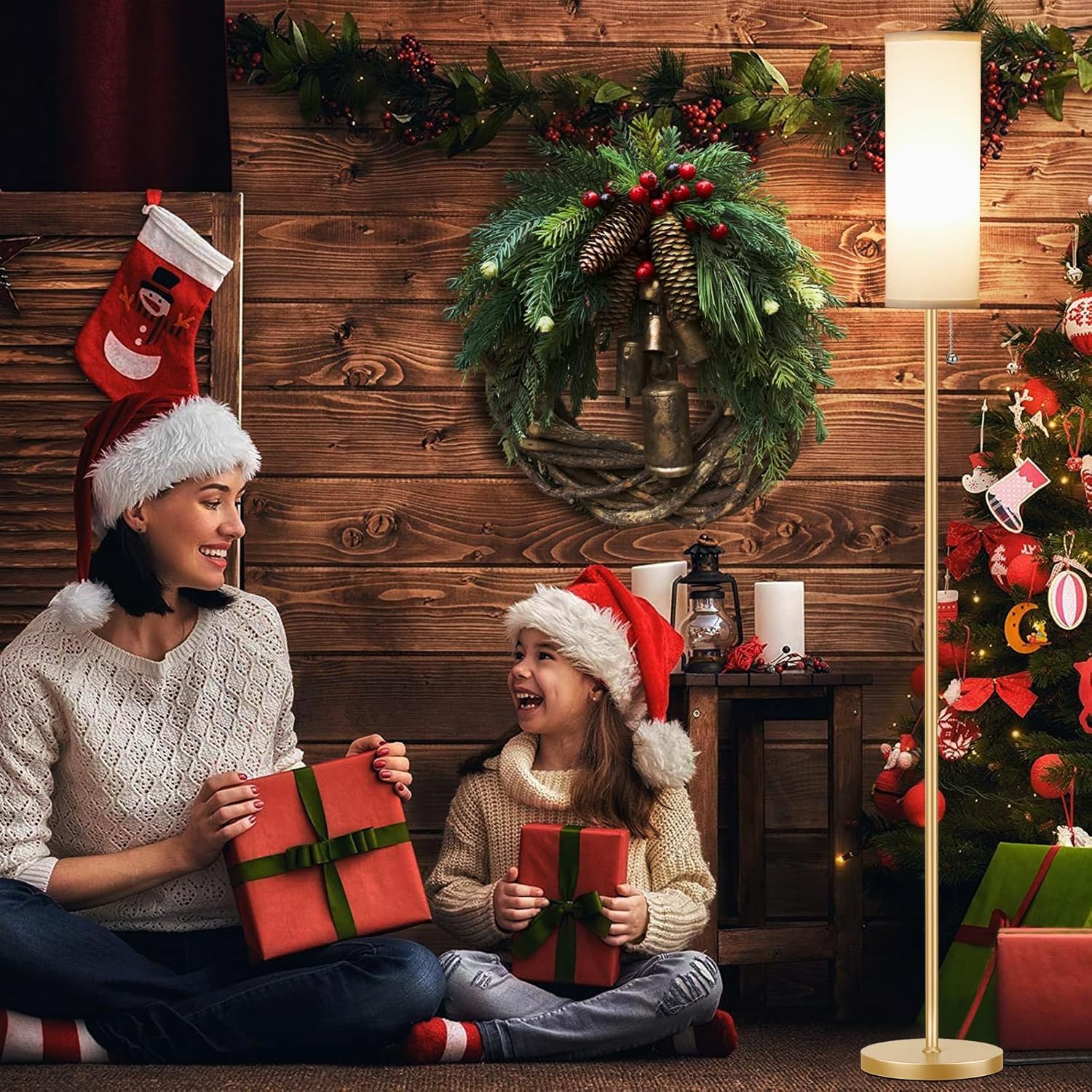 Ambimall Floor Lamp with 3 Color Temperatures Bulb, 64" Standing lamp with Linen lampshade for Bedroom, Minimalist Pole Lamp, White Shade & Gold Pole