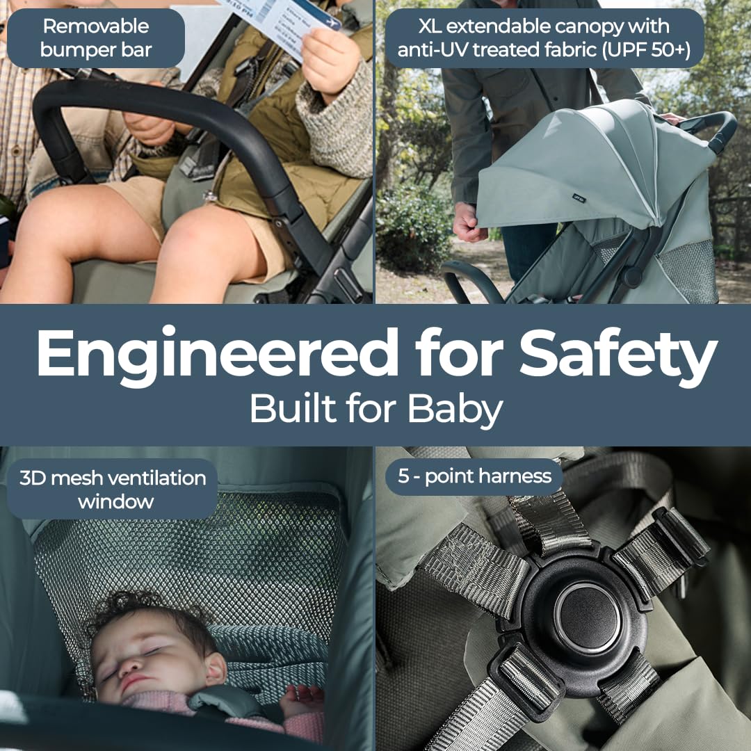 - BABY WELLNESS FEATURES: The Quid³ travel stroller offers a 5-point safety harnes & removable bumper bar, large 3D ventilation mesh ventilation window with magnets, soft & padded Jersey fabrics prevent excessive sweating, XL UPF 50+ canopy, BPA & nontoxic.