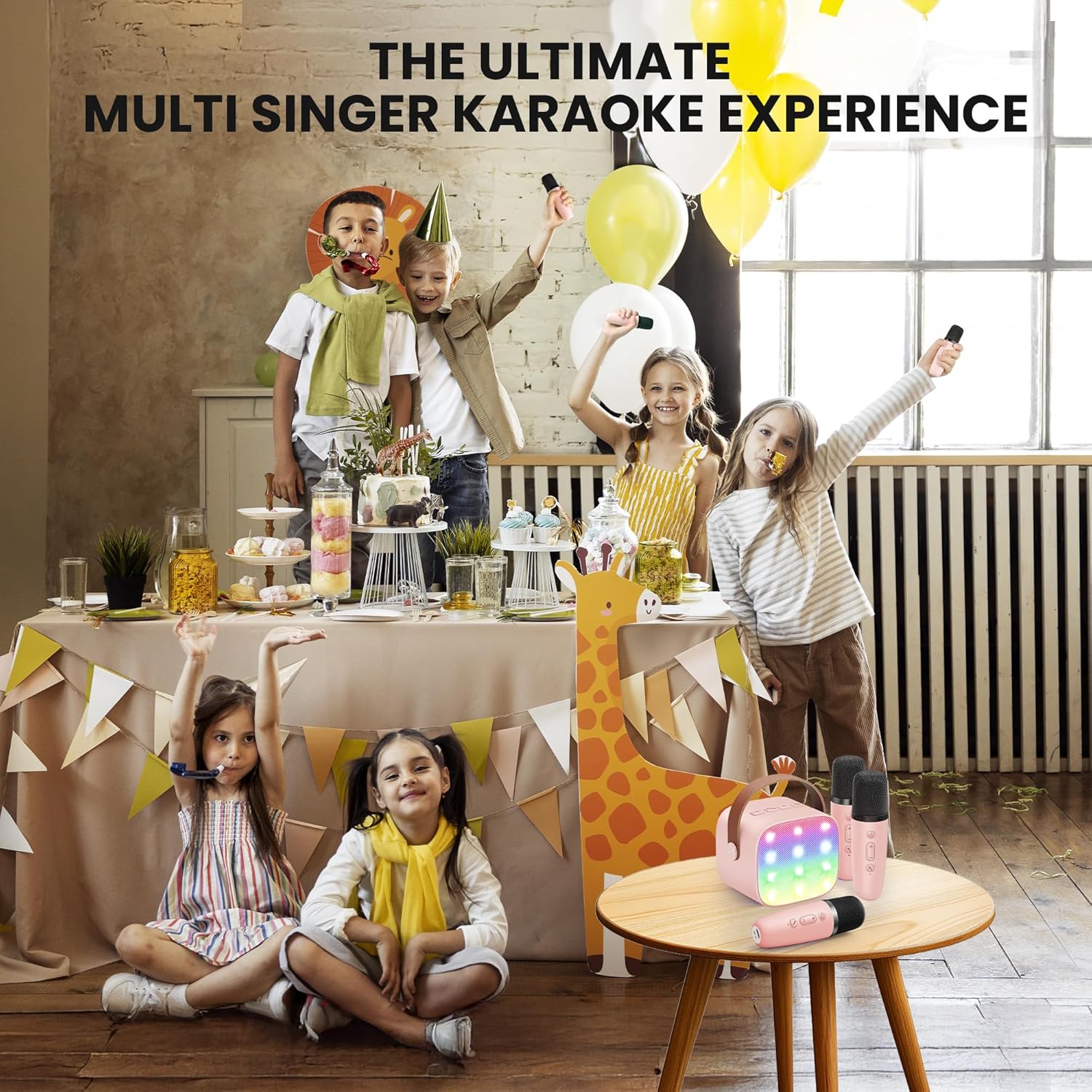 - Karaoke Machine with 3 Microphones: YLL mini karaoke set comes with 3 wireless mics, allowing 3 kids to sing at the same time, providing the ultimate multi-singer karaoke experience. No More 'Who's Next'. Just connect once with Bluetooth — no app, no setup, no hassle. After that, it lconnects automatically every time. Even the youngest kids can power it up and play on their own.