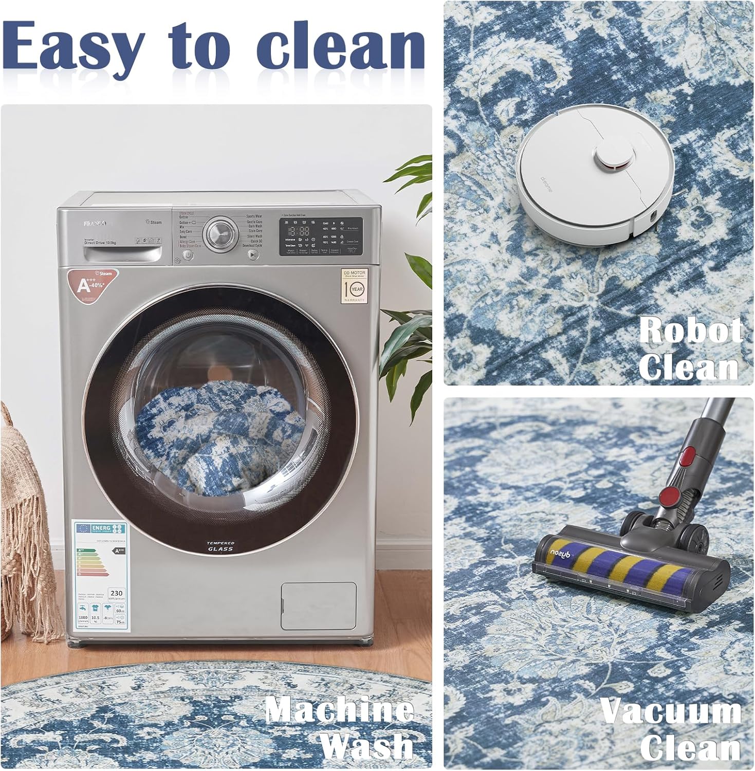 jinchan Round Rug 7ft Area Rug - Dark Blue Vintage Floor Mat Kitchen Indoor Ultra-Thin Soft Floral Print - Washable Circle 7' Retro Accent for Farmhouse Non Slip Dining Room Living Room Bedroom Office