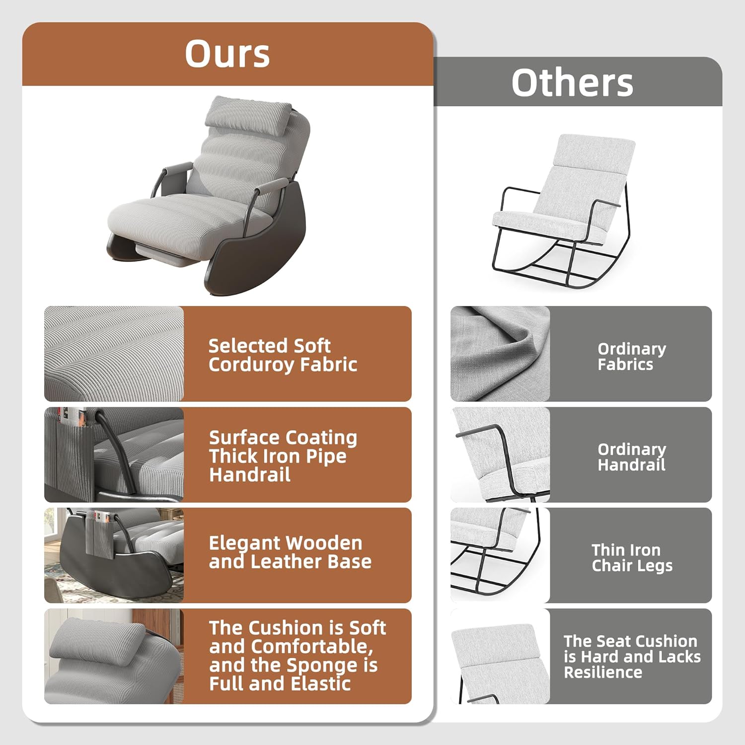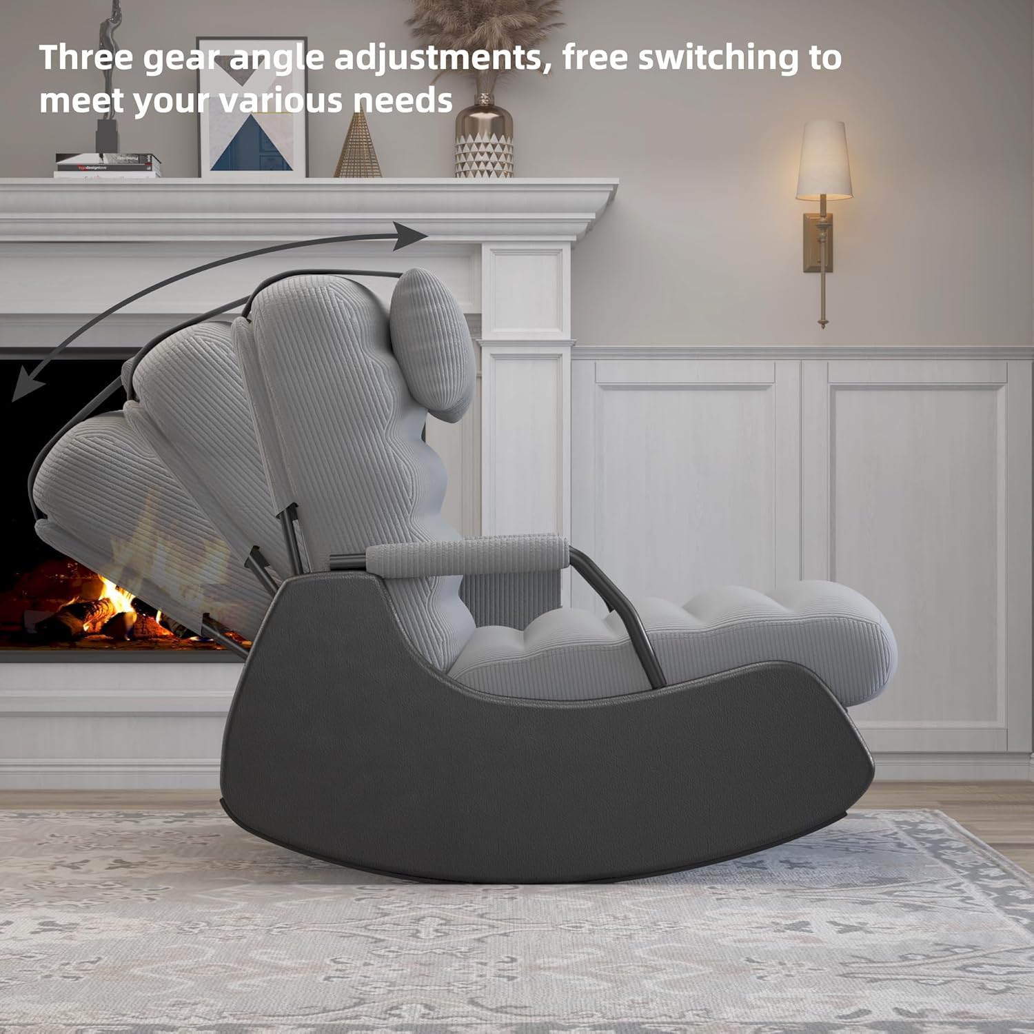- ERGONOMICALLY CURVED DESIGN:The curved back and soft seat cushions of this rocking chair provide excellent lumbar support, three-position adjustment, and retractable footrests for switching between rocking and reclining. The high-density foam padding and corduroy cover of this glider rocking chair are designed to retain its shape for long-lasting comfort.