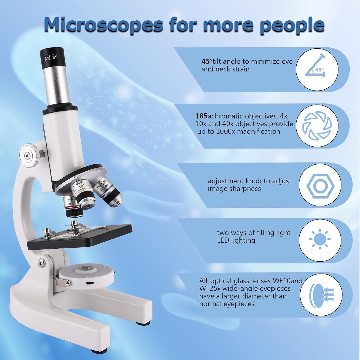 - 【Versatile Magnification Options】Microscope with WF10X/25X eyepieces reveal the intricate details of the micro world,complemented by high-precision objective lenses (4X, 10X, 40X) and a 2X magnifying lens.Easily achieve 40X-2000X magnifications,perfect for students,researchers,and curious families alike