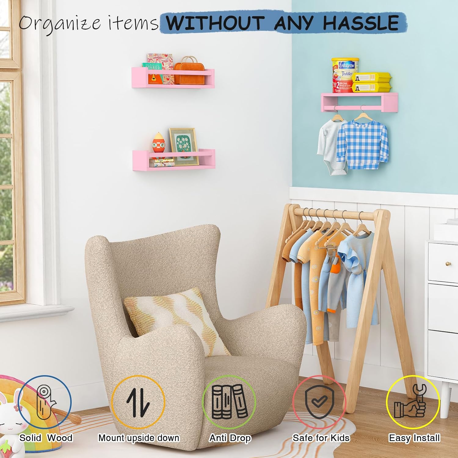 - [Versatile & Multifunctional] The pink floating nursery book shelves are no limit to creativity! Place them as wall bookshelf for kids’ room, baby book shelf for nursery, toddler book shelf and toy organizer for playroom, and it can even be used in the kitchen as a spice rack. Mount them upside down as kids clothes shelves in the bathroom and closet. They’re going to fit any space and any style thanks to their essential classic design.