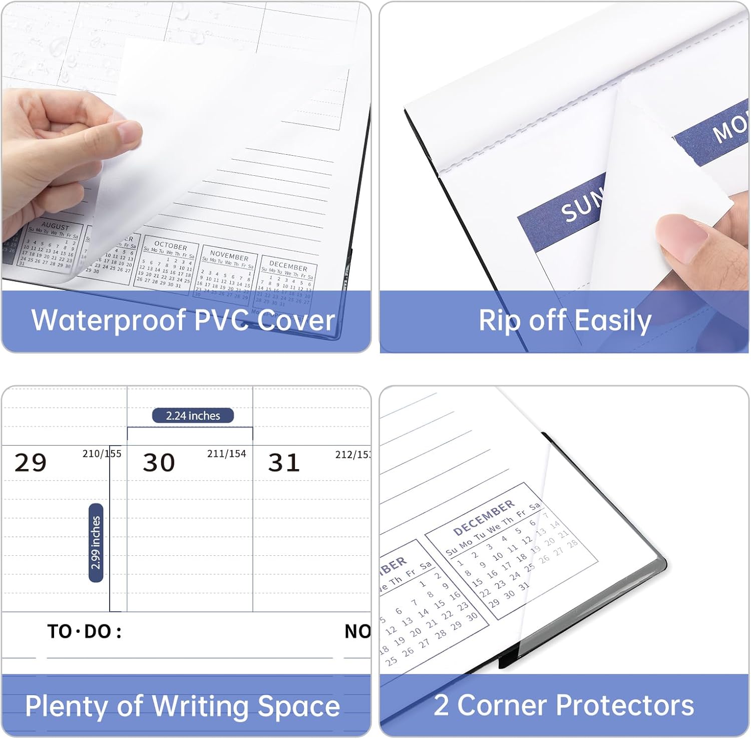 - Calendar Features: Thick paper resists ink seepage, ensuring clean and crisp writing. It comes with a transparent PVC cover to protect against dust and liquids, along with two corner protectors to keep the pages flat. The cutting line allows for effortless tearing of each month's page, making it perfect for long-term use as a wall calendar.