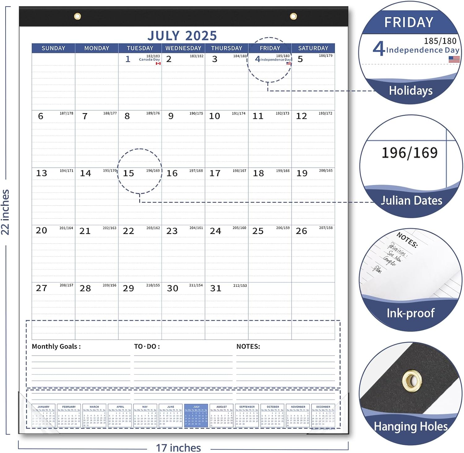 - 22" x 17" Large Calendar: Hanging wall calendar is designed with productivity in mind, offers an ample writing area that allows you to effortlessly schedule, plan, and keep track of crucial dates, deadlines, and holidays. Our calendar ensures that you can visualize and manage your daily, weekly, and monthly schedule with utmost ease and efficiency.