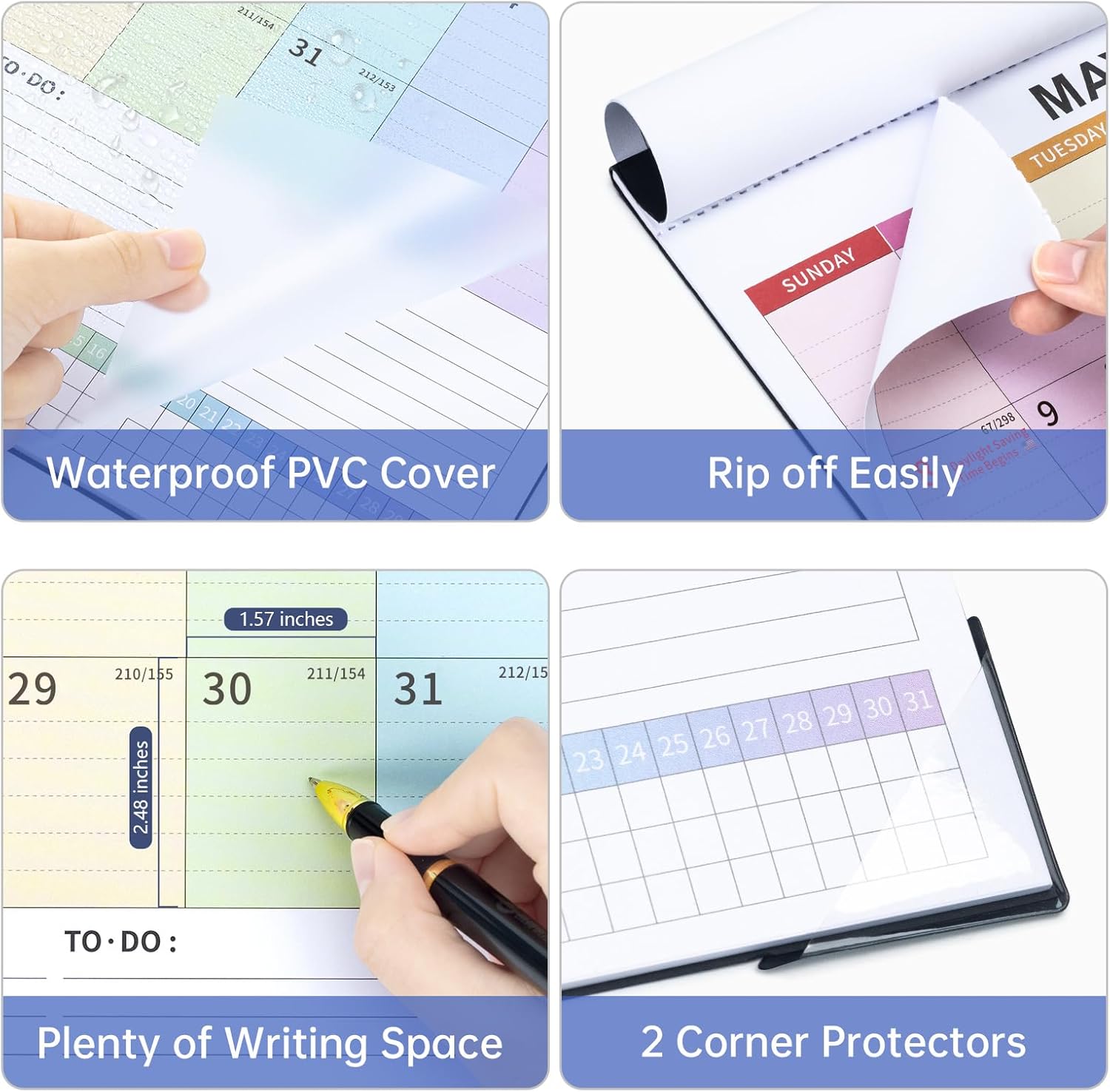 - Calendar Features: Thick paper resists ink seepage, ensuring clean and crisp writing. It comes with a transparent PVC cover to protect against dust and liquids, along with two corner protectors to keep the pages flat. The cutting line allows for effortless tearing of each month's page, making it perfect for long-term use as a wall calendar.