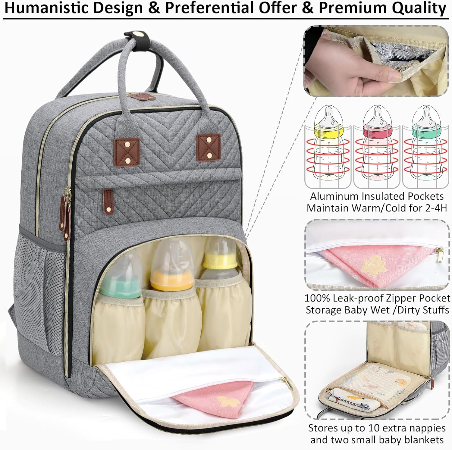 Diaper Bag Backpack for Women with Changing Pad, Baby Bag with Insulated Pockets Multifunctional Diaper Bags For Baby Girl Boy Waterproof Baby Bags For Boys Girls Maternity Bag Grey
