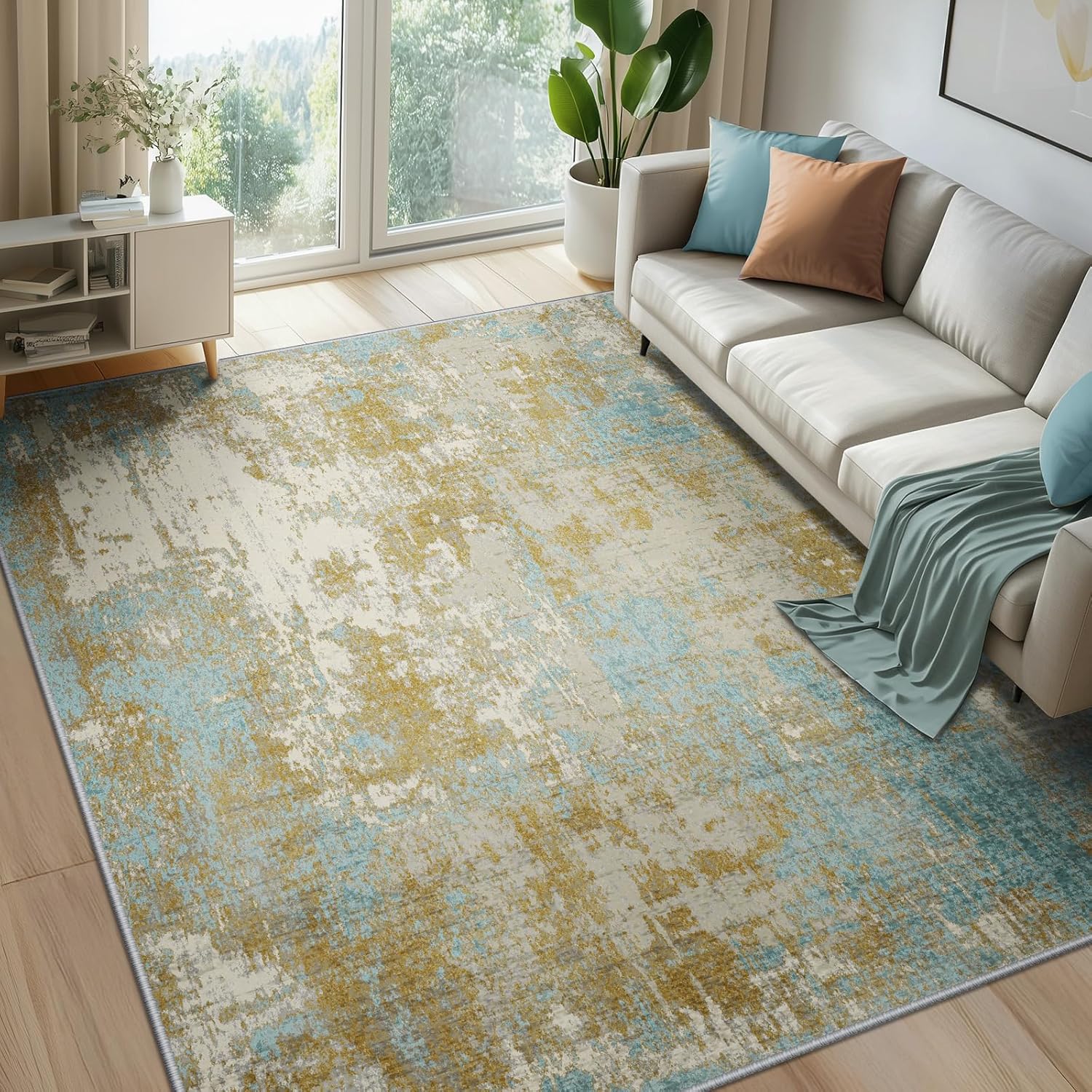 Washable Area Rugs 5'x7' Non-Slip Modern Abstract Soft for Living Room Entryway Bedroom Nursery, Print Pattern, Teal Blue Taupe