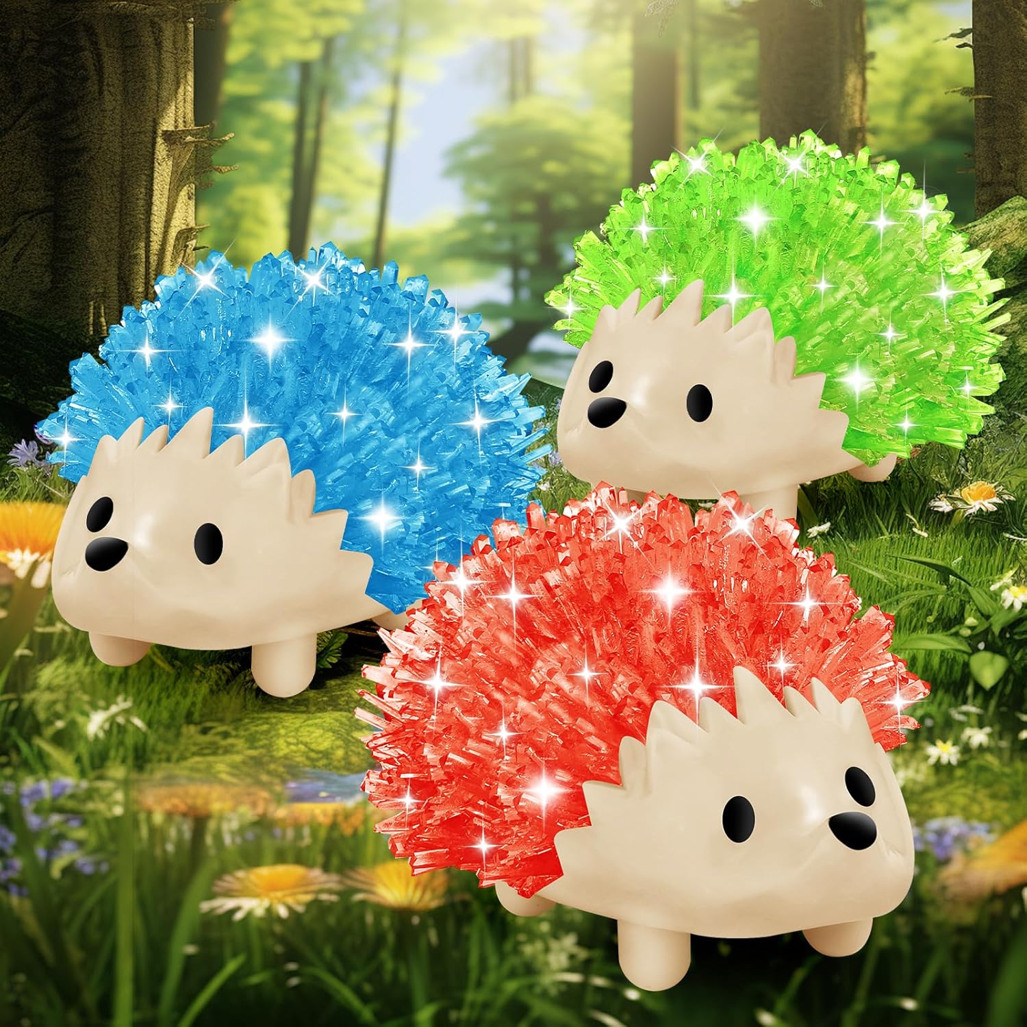 - 3 Colors hedgehog Crystal Growing Kit: This science kits for kids contains fast growing Blue、Green and Red Crystal,3 cute Hedgehog Models,3 plastic container,3 stirring sticks,1 instruction.Let your kids have fun with chemistry