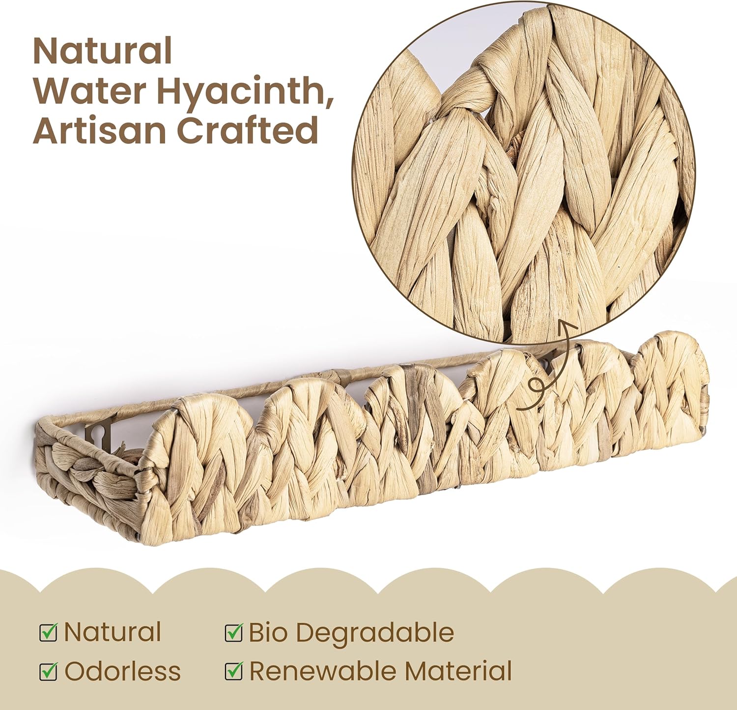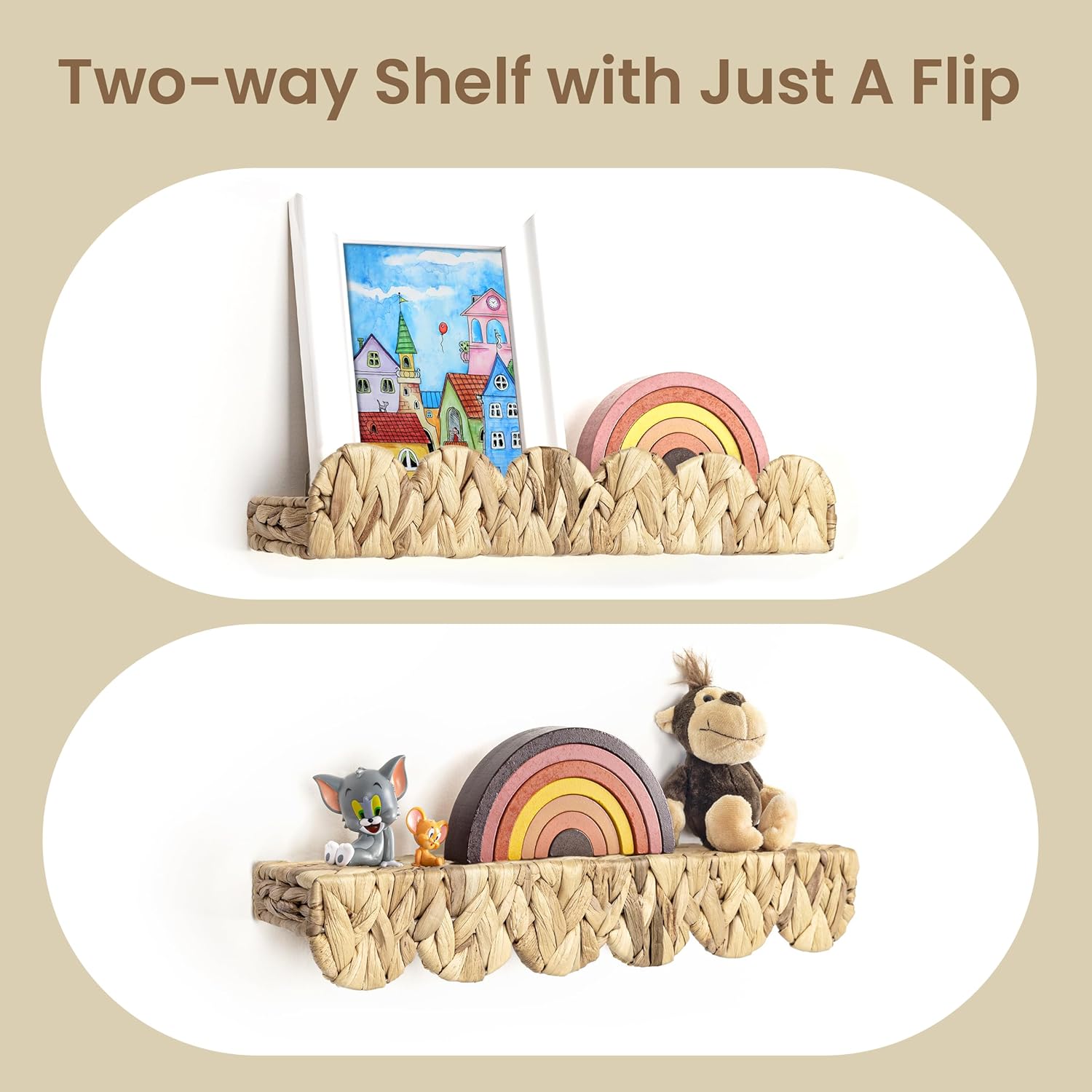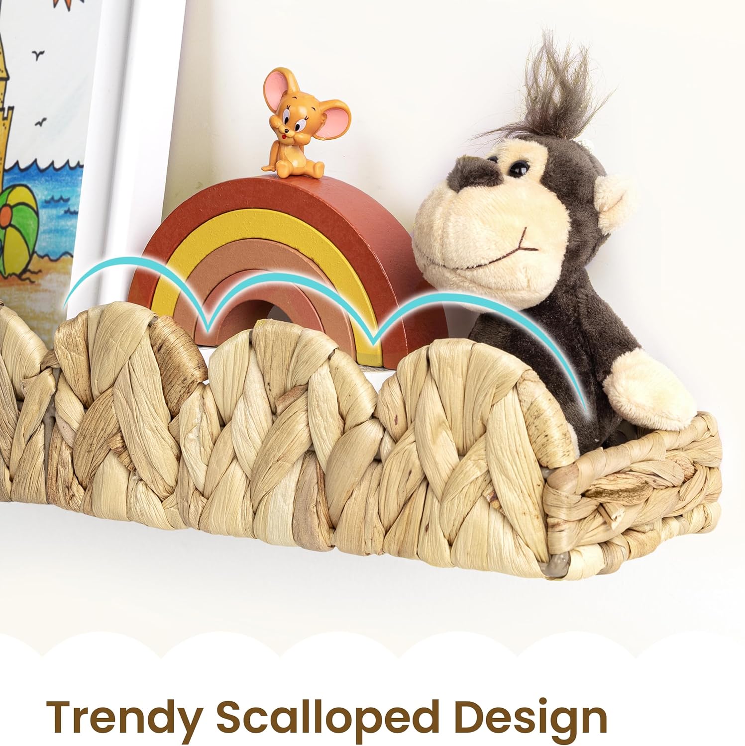 - Versatile & Scalloped Design: Upgrade your child's space with AELS water hyacinth shelves—ideal for lightweight books, toys, and decor. Flip them upside down for fresh looks in any room, from nurseries to playrooms. Woven beauties blend style and function.
