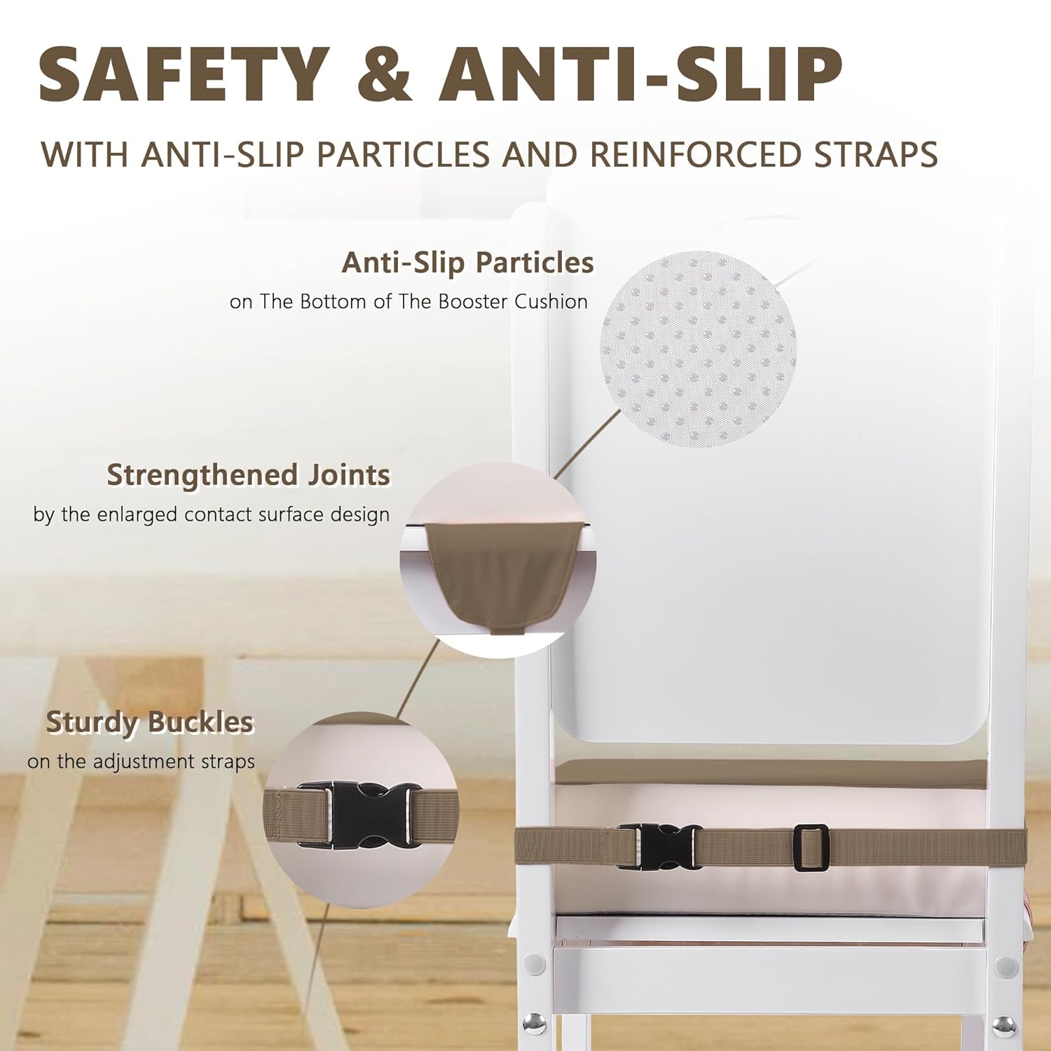 - 【Safety & Anti-slip】The booster seat for table features anti-slip particles and reinforced straps. The anti-slip particles provide excellent resistance to prevent the seat from sliding on the surface of the chair. This ensures your baby stays firmly in place while sitting. The straps add an extra layer of safety, keeping the seat securely fixed to the chair and minimizing the risk of movement. Your baby will be very safe and stable during mealtime or any other activity at the kitchen table.