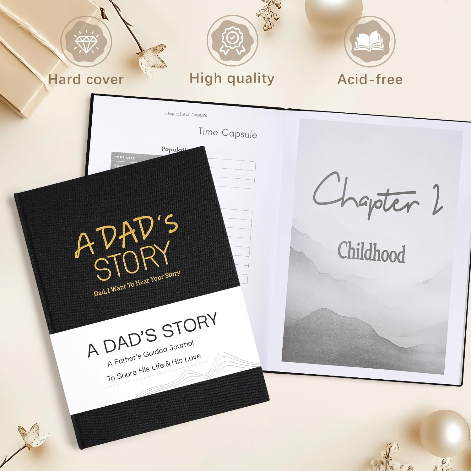 - Include 1 guided journal book with prompts questions, it's a perfect gift idea for dad. There are more than 250 fun questions to fill out, and these questions are carefully designed to help a dad share his memories and tell his life story in his own way.