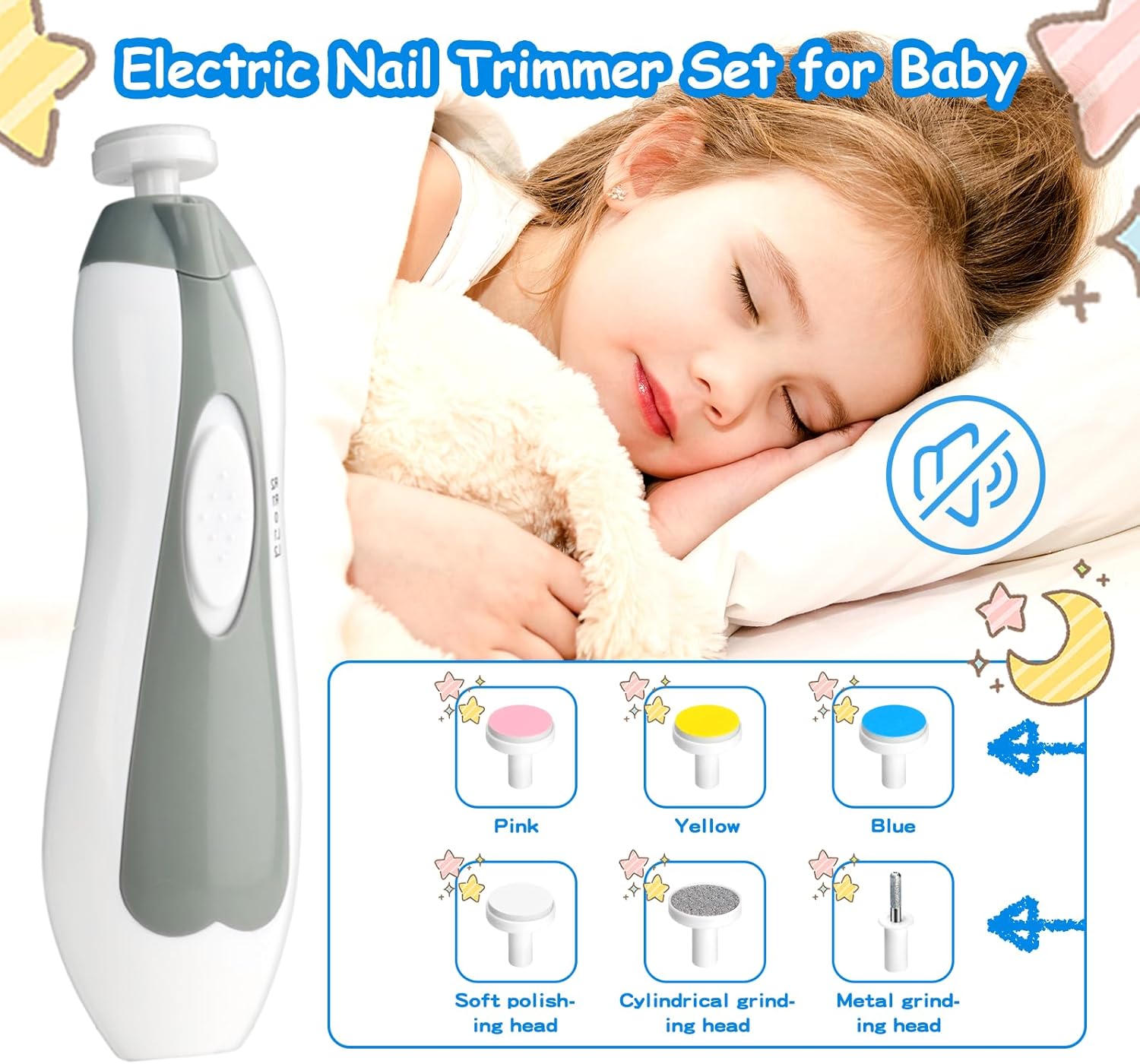 - Electric Nail Trimmer: The ergonomic design for easy gripping, and it comes with 6 grinding heads, easy to trim babies' nails without hurting their skin. Two-way rotation, two-speed regulation, silent and simple operation.