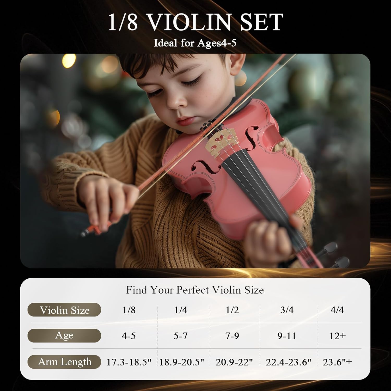 1/8 Violin Kit, Beginner Violin for Kids, Students, Complete Kids Violins Set with Case, Bow, Rosin, Ideal for Kids Violins Beginner Ages 4-5, Pink