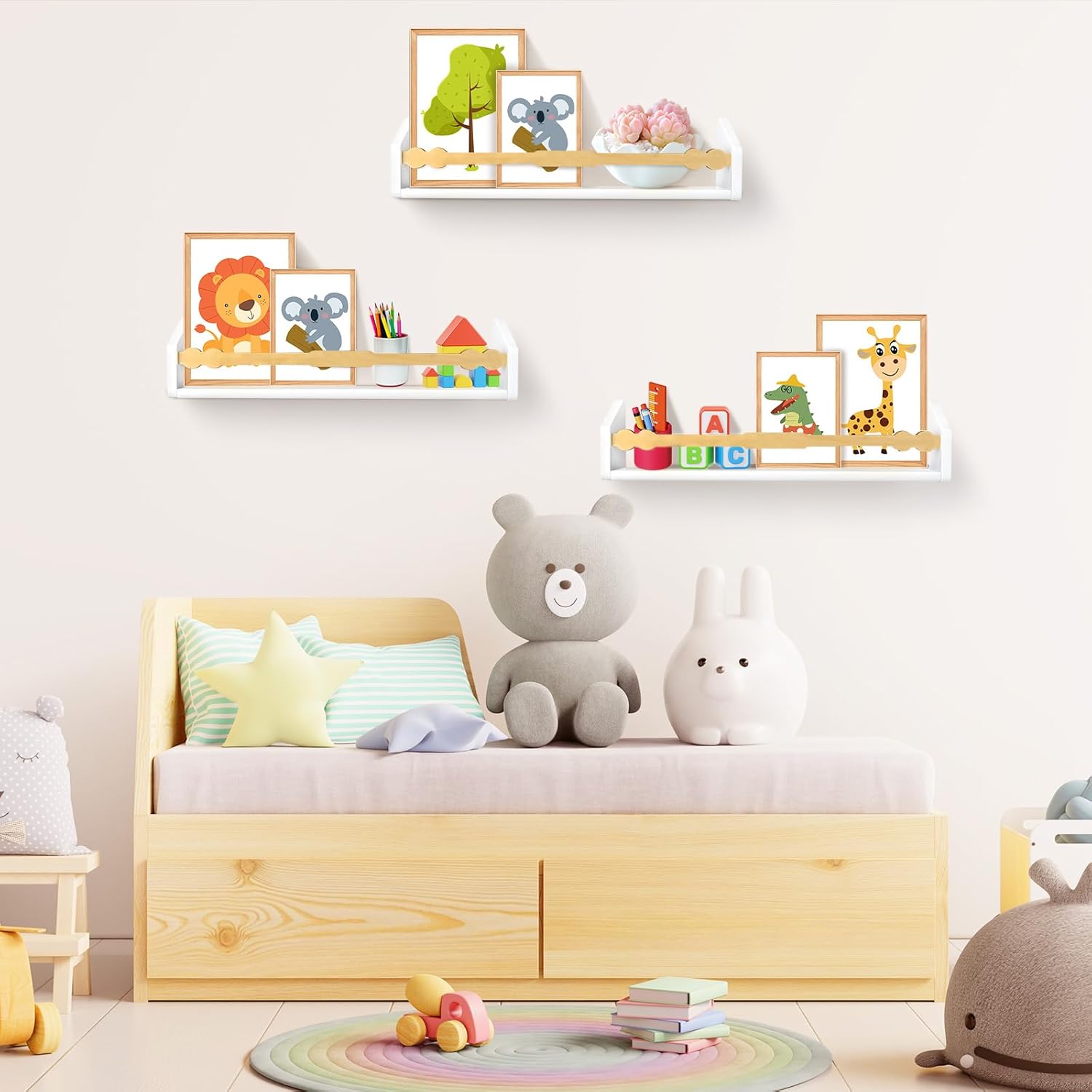 - Beautiful Nursery Shelves: Floating nursery shelves provide enough space. One set contains 3 bookshelves of the same size. Each shelf measures 15.74 x 3.94 x 3.82 inch to meet your different usage needs