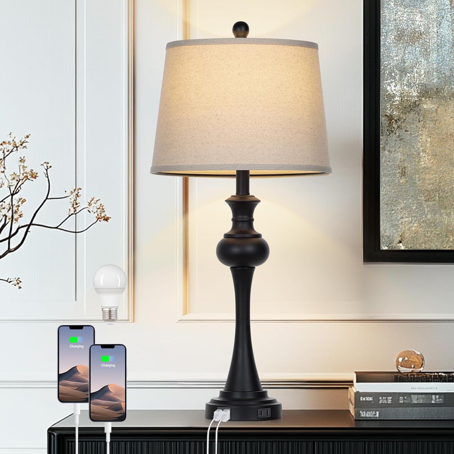 - USB Fast Charging Ports: Our table lamps for living room have two USB charging ports on the black lamp base to facilitate your life, which enables you to charge your mobile phone, tablet PC, humidifier and other electronic devices at any time, even if the bedroom lamps for nightstand is off, you can still use these charging ports, fully saving your time and space, you no longer see the messy cables on the table.
