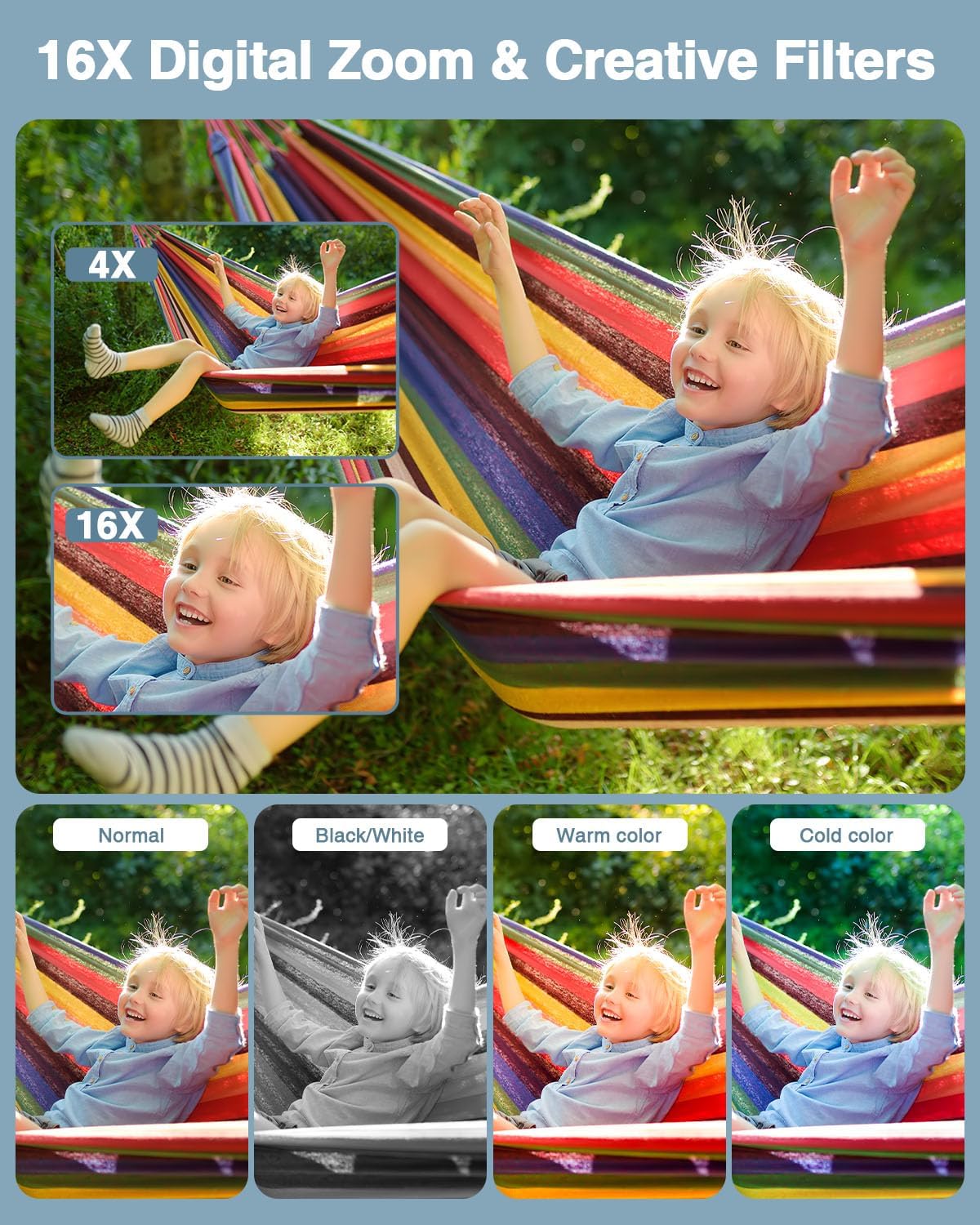 - SAFE MATERIALS & CREATIVE FILTERS - Made of high-grade and eco-friendly reliable materials, the kid camera is safe and non-toxic, durable and withstands drops. This digital vlogging camera for teens also supports six cute filter effects to choose from, kids could create more adorable colorful pictures.