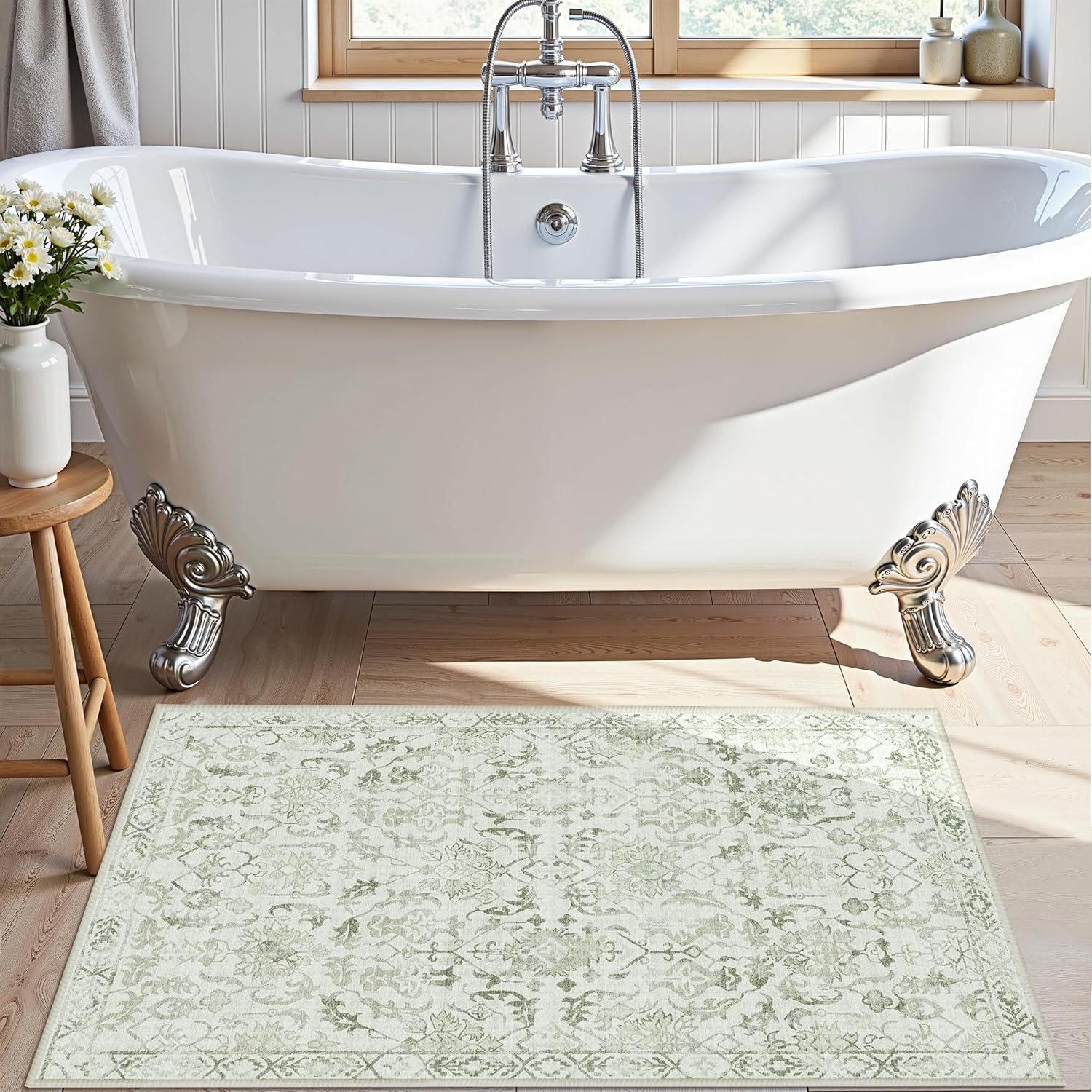 Sage Small Area Rug 2x3 Throw Rug for Entryway Bathroom Kitchen, Non-Slip Low-Pile Washable Distressed Modern Boho Floor Carpet for Laundry Room, Indoor Washstand Vanity Front Mat 24x36 Inch