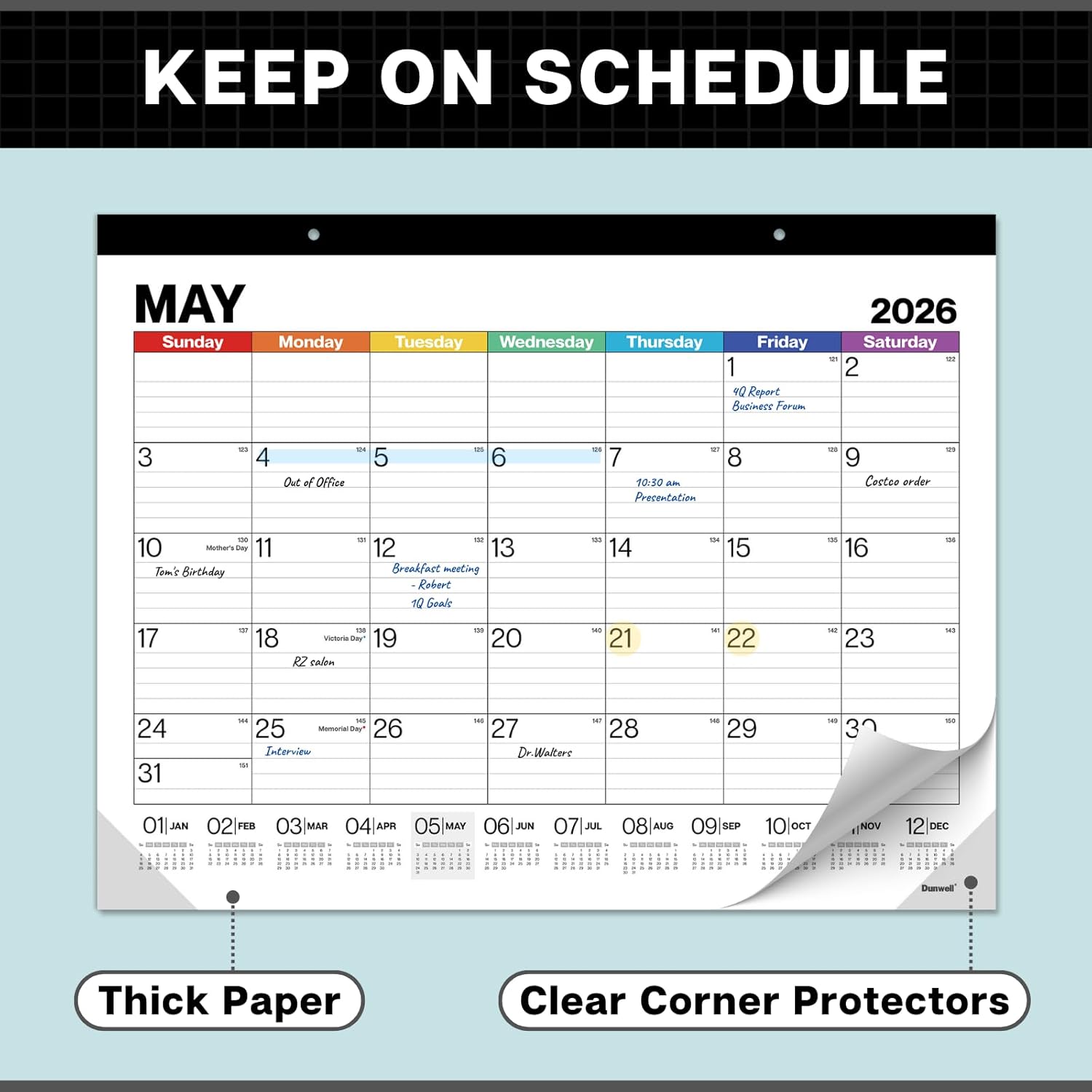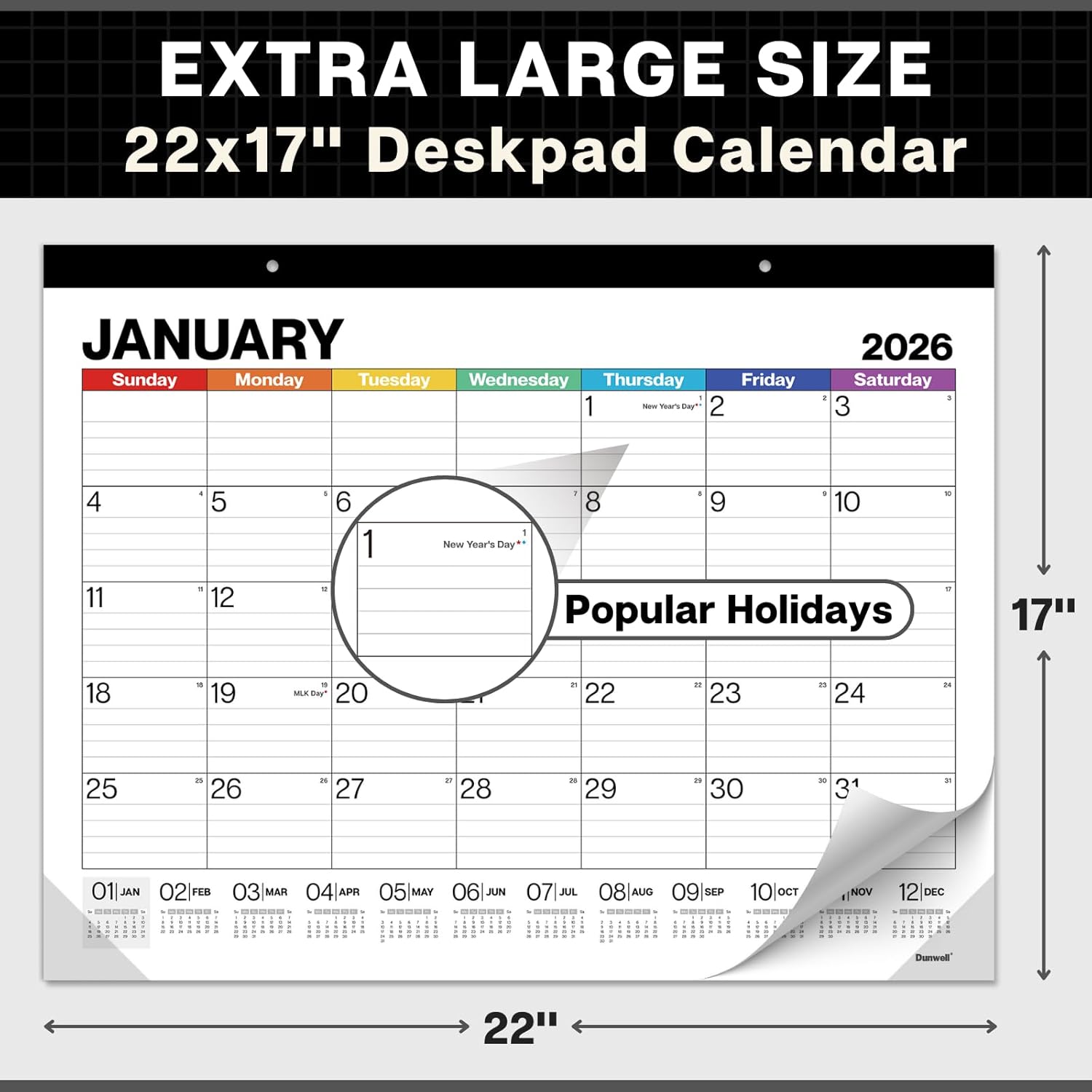Dunwell 22x17 Desk Calendar 2025-2026 (Colorful), Use Now to Dec 2026, as Large Hanging Wall Calendar or Big Monthly Desktop Blotter, Lined Daily Blocks, Easy to Read, Perfect for Office or Home