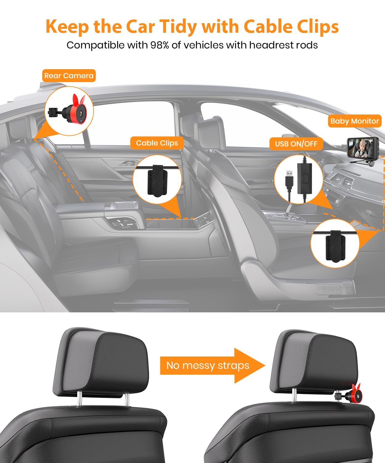 - Stability & Effortless Setup: The BV2 baby car camera clips securely to your headrest for quick, easy installation—no more struggling with tangled straps. The anti-shake clip ensures a stable, clear image even on bumpy roads. Making every journey more stress-free
