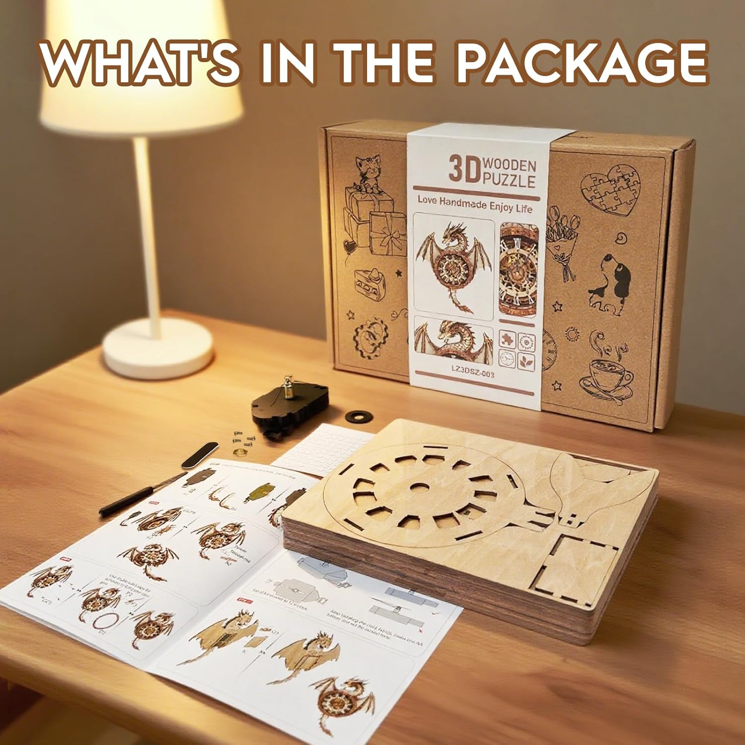 - 【3D Puzzles for Adults】Build a stunning mechanical clock with this intricately designed DIY clock kit, featuring a three-dimensional dragon motif and Roman numeral dial. Perfect for hobbyists seeking challenging 3D puzzles that combine artistry with engineering.