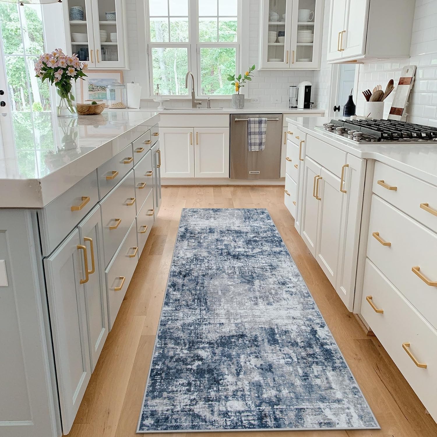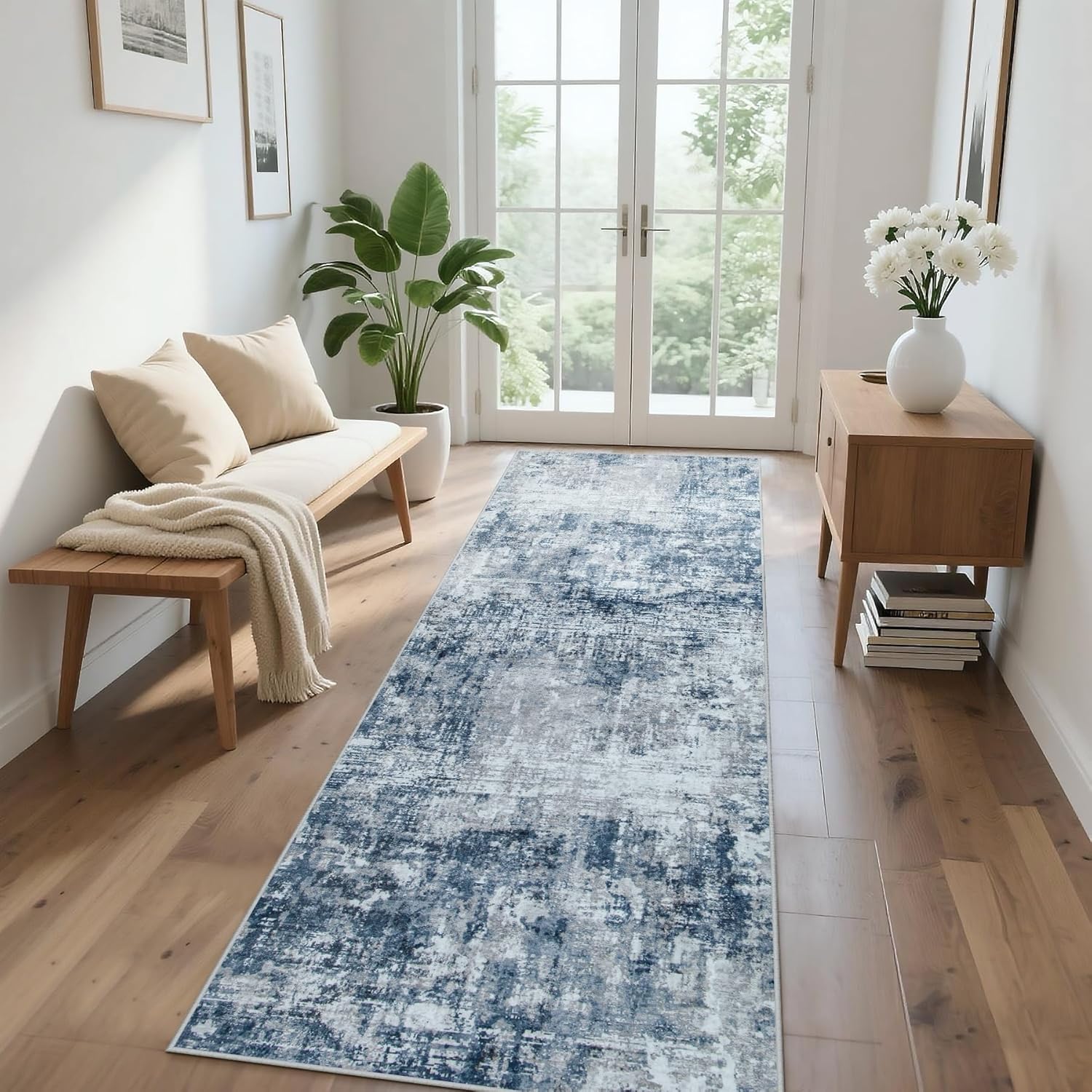 Runner Rug for Hallways Kitchen 2'6"x8' Washable, Non Slip Carpet 8ft Area Rugs Entryway Rubber Backed 8 Feet Neutral Abstract Modern Low Pile Indoor Blue Grey