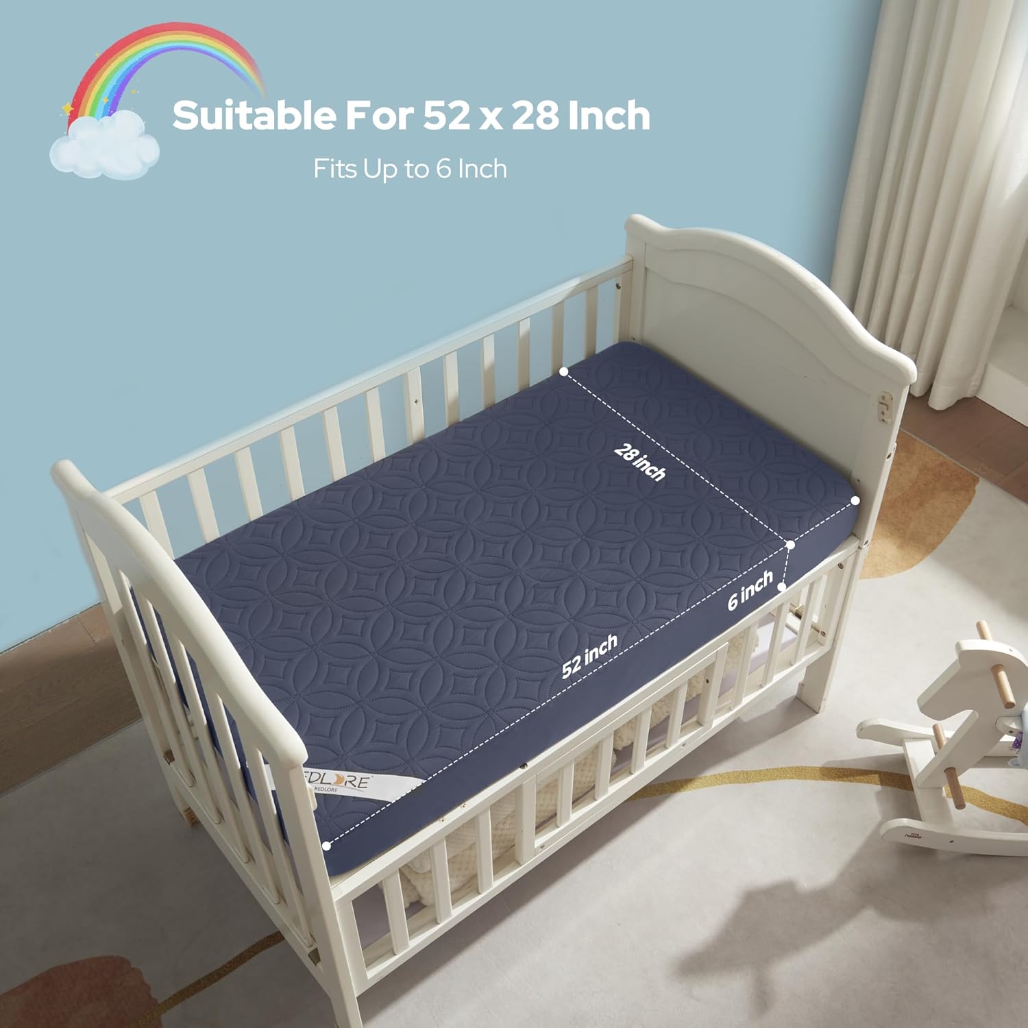 - Easy Fit: Measures 52''x28'', our crib mattress cover fits most standard crib mattresses up to 6 inches thick. The elasticized edges provides a snug fit on your crib mattress