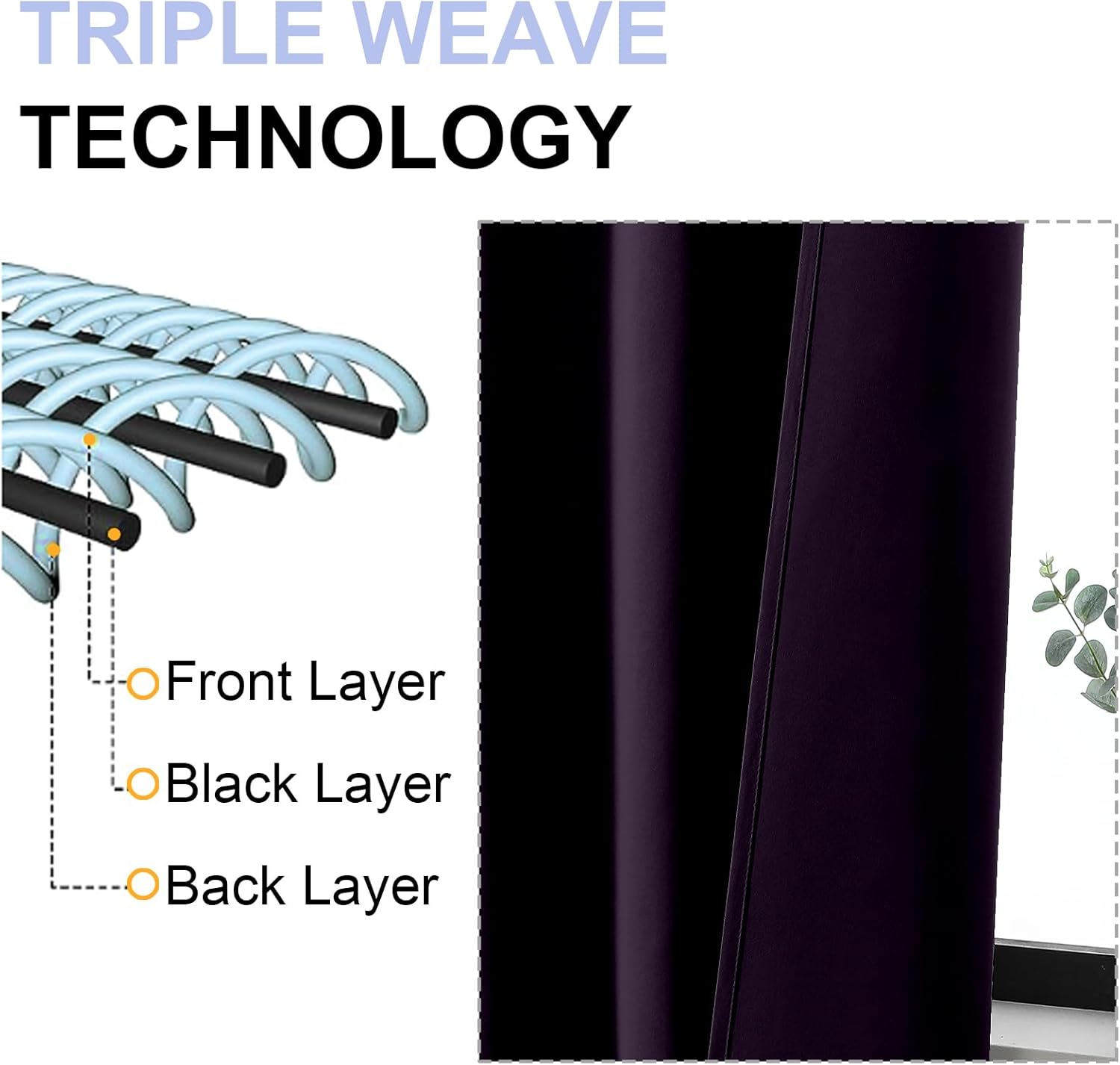 - High-Quality Materials: Crafted from high-quality polyester fiber, guarantee both stiffness and drape. This soft yet durable light-blocking fabric boasts a three-layer weave, with a middle layer of black yarn acting as an effective light-blocking panel, effectively blocking light while providing privacy. The identical colors on both sides further enhance its aesthetic appeal, adding a touch of elegance to your home