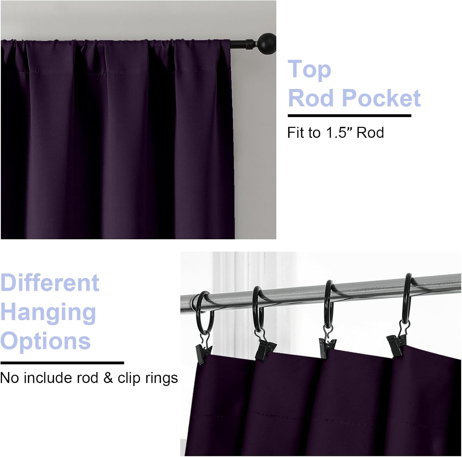 - Pair Sold: Each package includes 2 panels of short blackout curtains. Each panel measures 40"W x 63"L, with a pair measuring 80"W x 63"L. The curtains blackout have 2 hanging options (Rod pocket & Clip Style) with a 3-inch rod pocket to fit standard or decorative curtain rods. Don't worry if this blackout curtain is a few inches shorter than your window. Hang with rings & hooks for easy 3-4" height adjustment