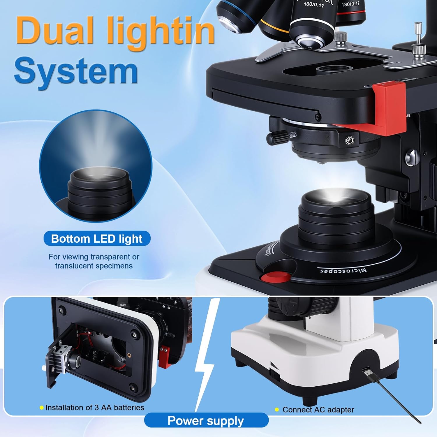 40X-2500X Binocular Microscope, WF10x and WF25x Eyepieces, LED Illumination, with Specimen Handpiece Holder, for Beginners, Microscope for Adults