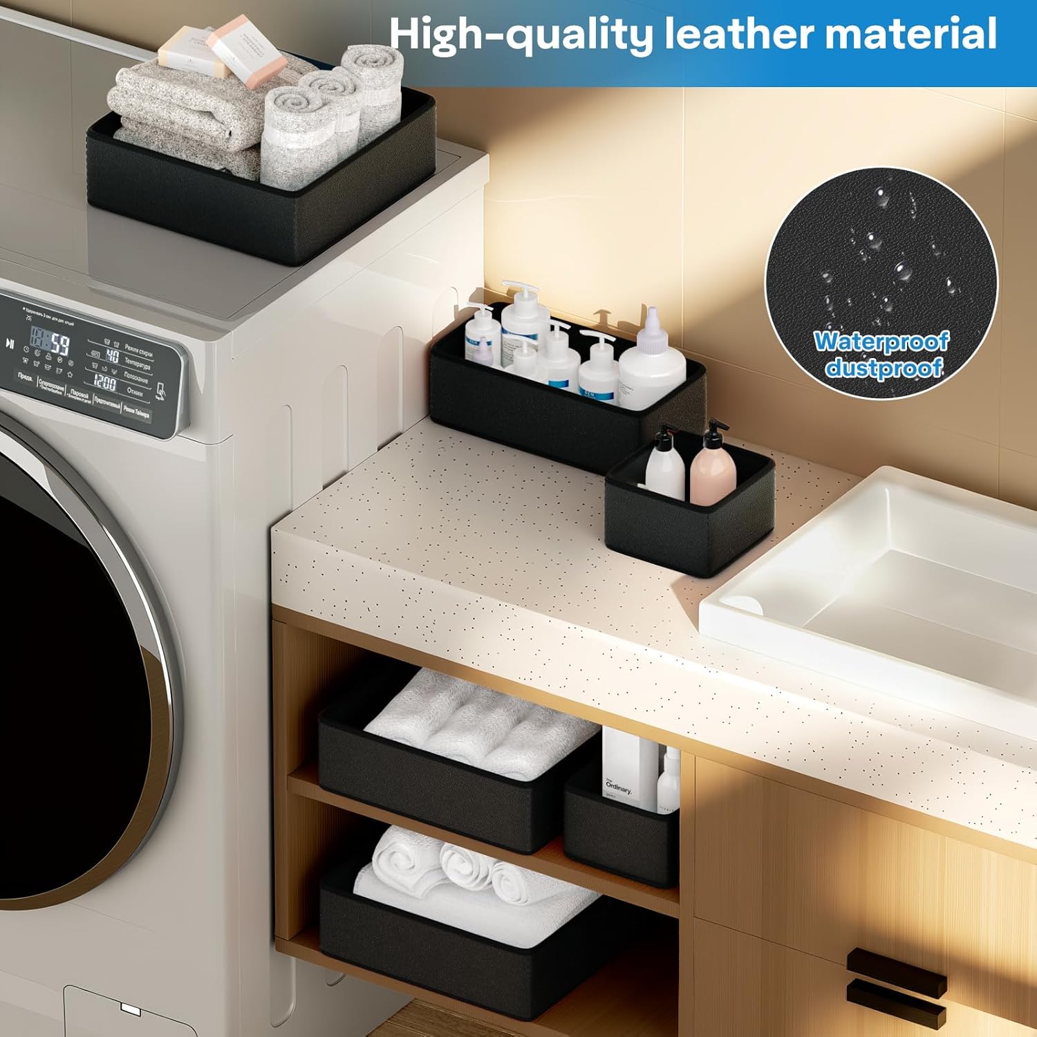- 【Luxurious Decorate】 Decorate your space with our vegan leather drawer organizers. This 12 piece set features three versatile sizes (3 Large: 11"x11"x4.5", 3 Medium: 11"x5.5"x4.5", 6 Small: 5.5"x5.5"x4.5") ,You can place them anywhere in your home or office.Don't worry about the dust on the outside,Just wipe them with a wet tissue and they'll be as clean as new.