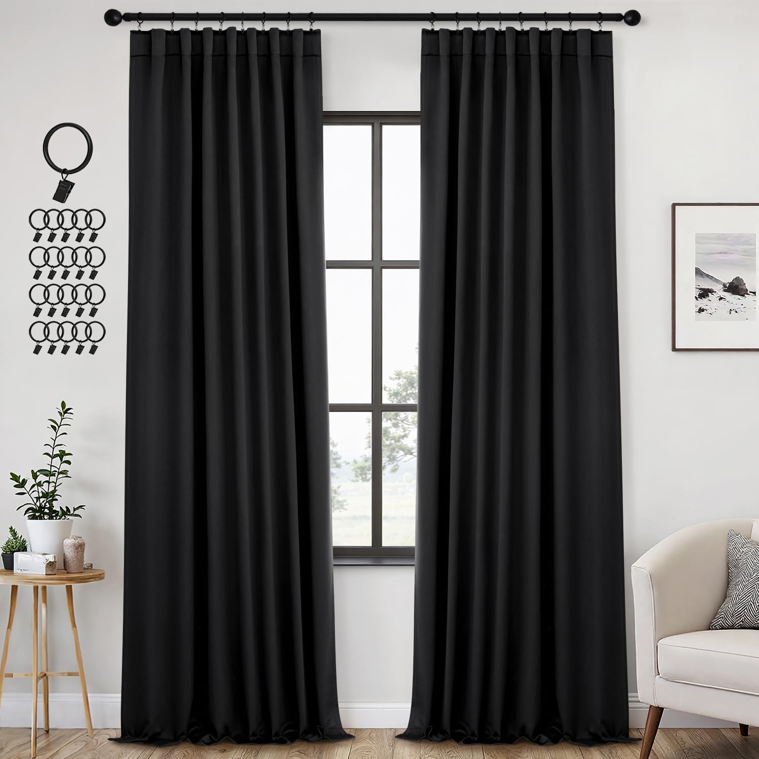 - MULTIPLE HANGING OPTIONS:Each curtain panel has 3-in-1 top style design: Rod Pocket, Back Tab and Pinch Pleat.We will include 20 pin hooks and clips for each pair of curtains (rings included)