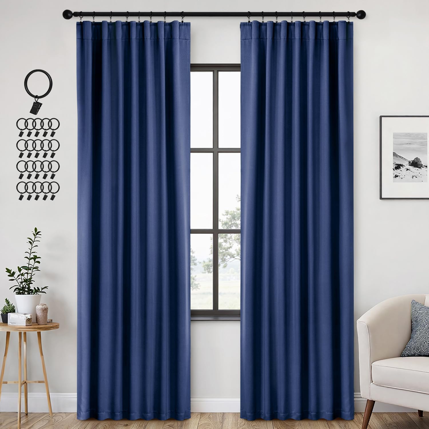 ANRODUO Back Tab Blackout Curtains for Bedroom Living Room, Rod Pocket Pinch Pleated Thermal Insulated Room Darkening Curtains 90 Inches Long 2 Panels, Navy Blue, 42 x 90 Inch