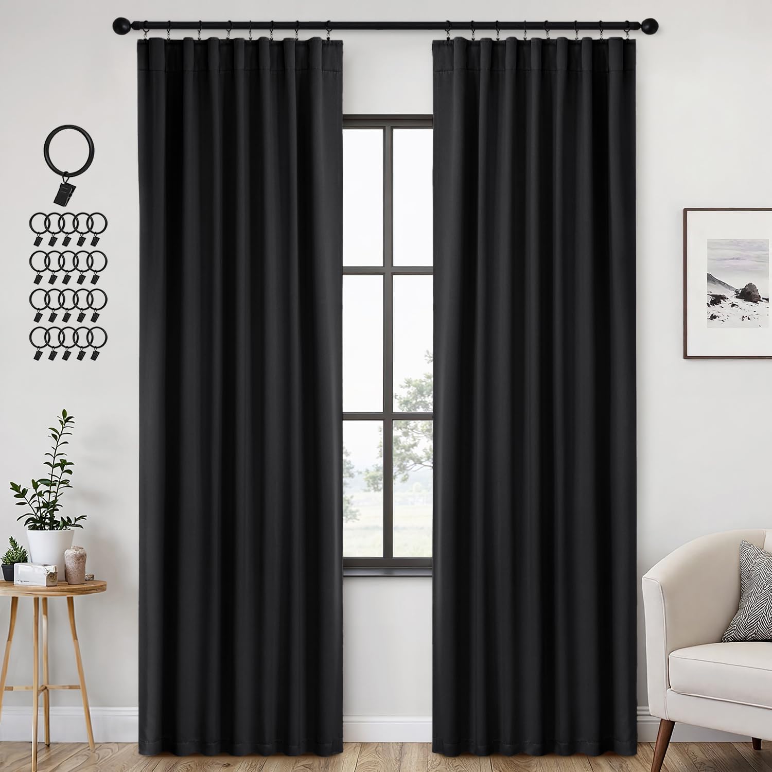 - MULTIPLE HANGING OPTIONS:Each curtain panel has 3-in-1 top style design: Rod Pocket, Back Tab and Pinch Pleat.We will include 20 pin hooks and clips for each pair of curtains (rings included)