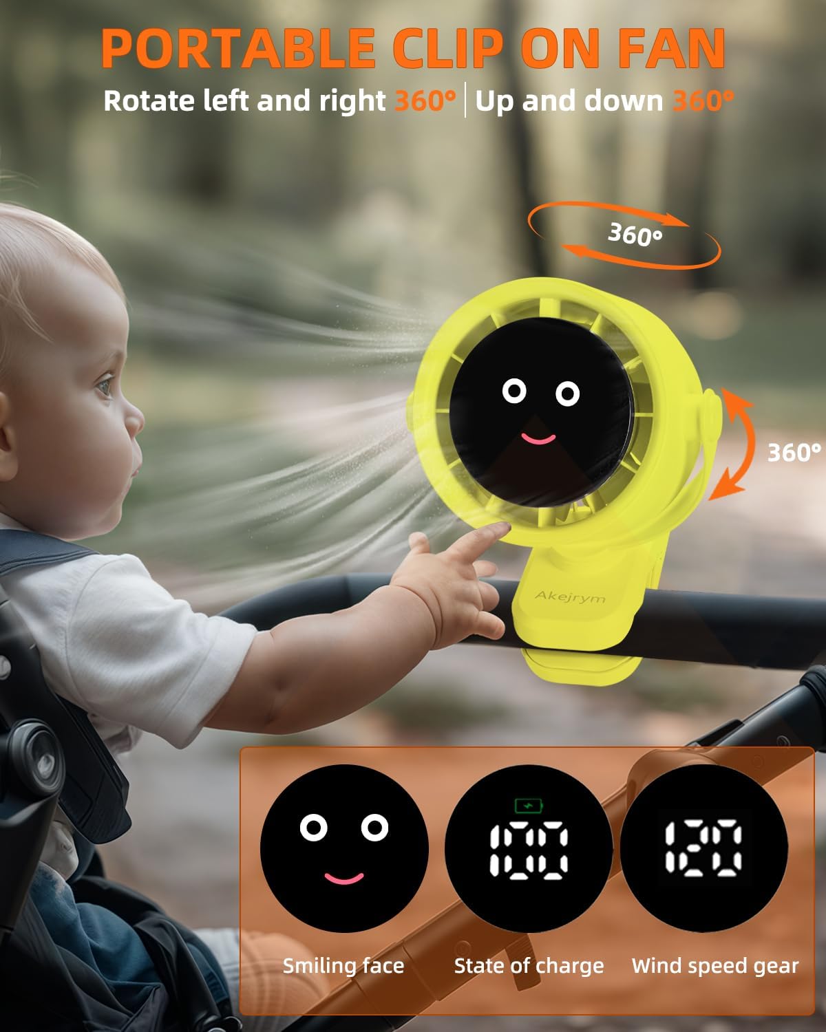- 【360° Rotation and 5 Speeds】Akejrym Baby Stroller fan head can be adjusted vertically and horizontally in any direction, providing cool airflow from all directions to keep your baby comfortable in hot weather;It has 5 different speeds for different purposes, which is more comfortable for babies.