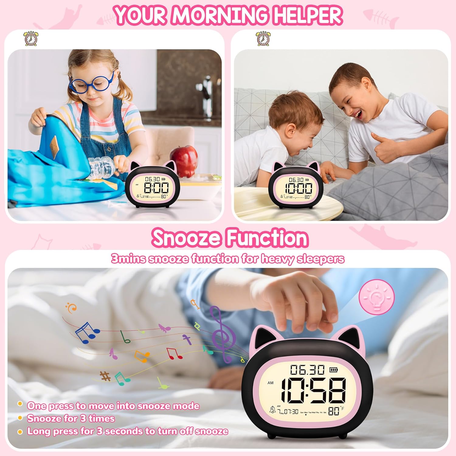 - 🐱 【Adorable Cat-Shaped Alarm Clock for Kids】This charming cat-shaped digital alarm clock is specially designed for children. Its cute and friendly appearance makes it a delightful addition to any child' s bedroom, helping to encourage better time management and sleep habits.