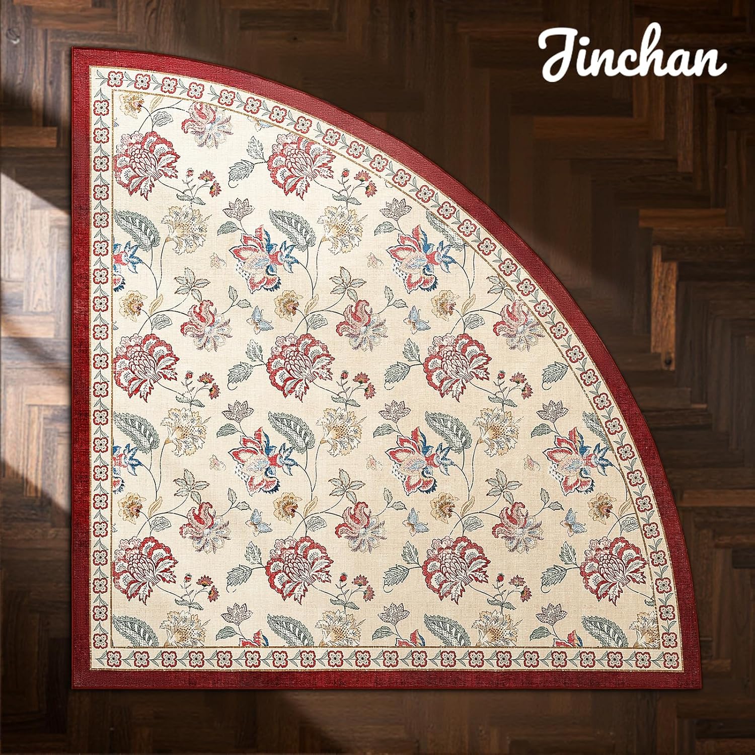 jinchan Floral Corner Rug for Entryway Washable Kitchen Rug Vintage Romance Design Non Slip Quarter Circle Lightweight Low-Pile Throw Carpet for Playroom Reading Nook Nursery, 4ft Radius, Red/Beige