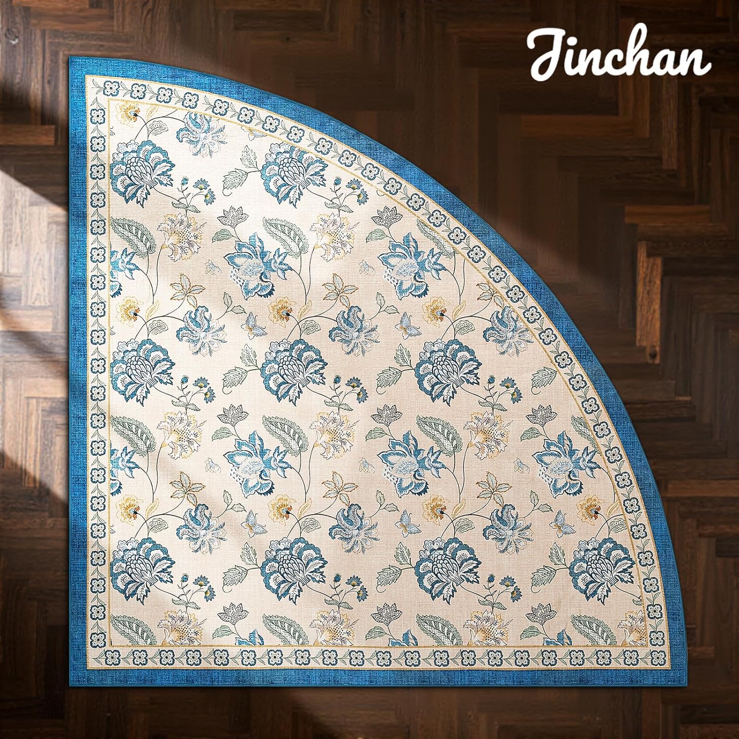 jinchan Floral Corner Rug for Living Room Washable Bedroom Rug Vintage Romance Design Non Slip Quarter Circle Lightweight Low-Pile Throw Carpet for Reading Nook Playroom,6ft Radius, Blue/Beige