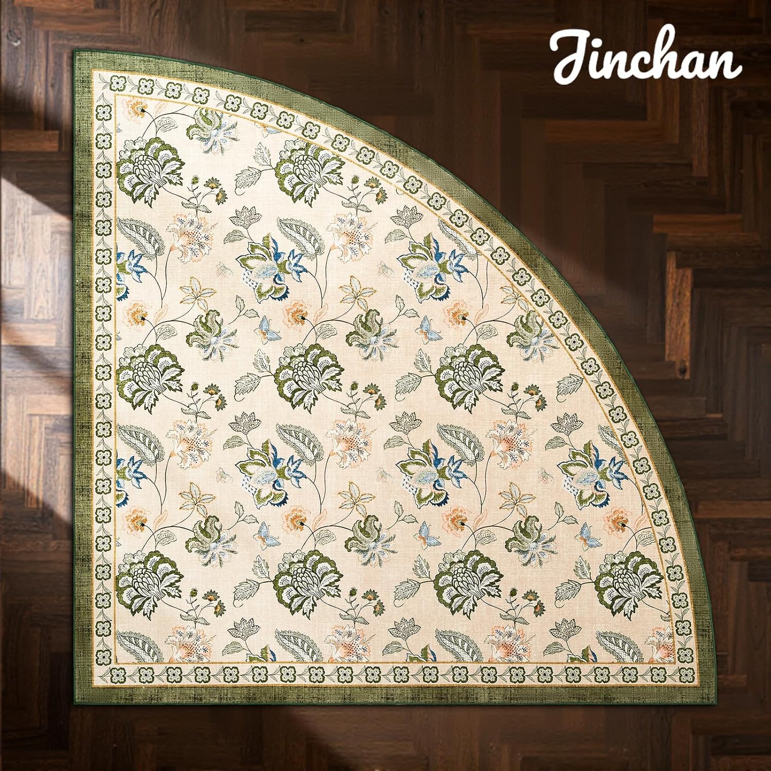 jinchan Floral Corner Rug for Living Room Washable Bedroom Rug Vintage Romance Design Non Slip Quarter Circle Lightweight Low-Pile Throw Carpet for Reading Nook Playroom,8ft Radius, Green/Beige