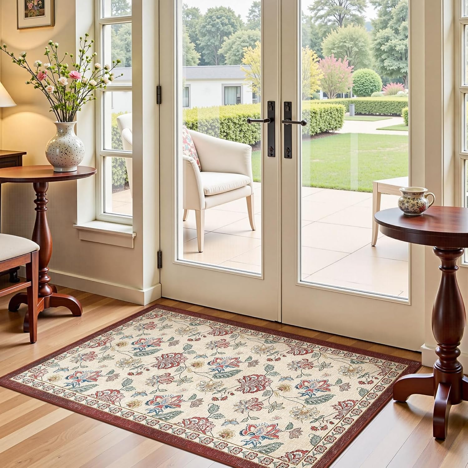 jinchan 3x5 Floral Rug for Entryway Washable Kitchen Rug Vintage Romance Design Small Mat Non Slip Indoor Doormat Lightweight Low-Profile Throw Carpet for Entrance Bathroom Laundry Room, Red/Beige