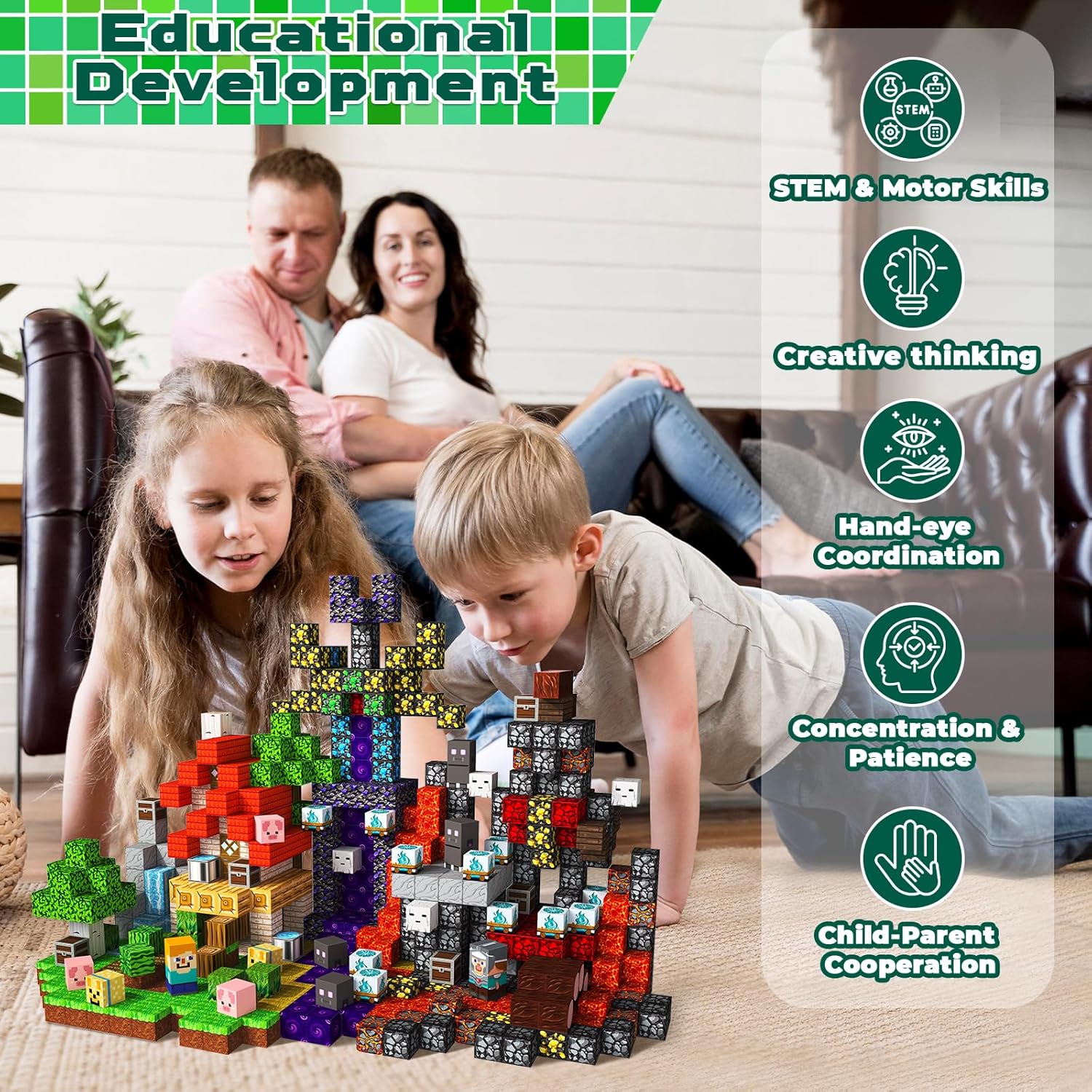 - 🌲【Safe, Durable, Compatible Magnetic Blocks】 Made with non-toxic materials and smooth edges, these washable, safety-certified magnetic cubes are built to last. Seamlessly connect with other magnetic tile sets to create wooden cabin, lava cave, magical portal, or entirely new worlds. Perfect for kid ages 3 4 5 6 7 8 9 10 11 12 13 years old.