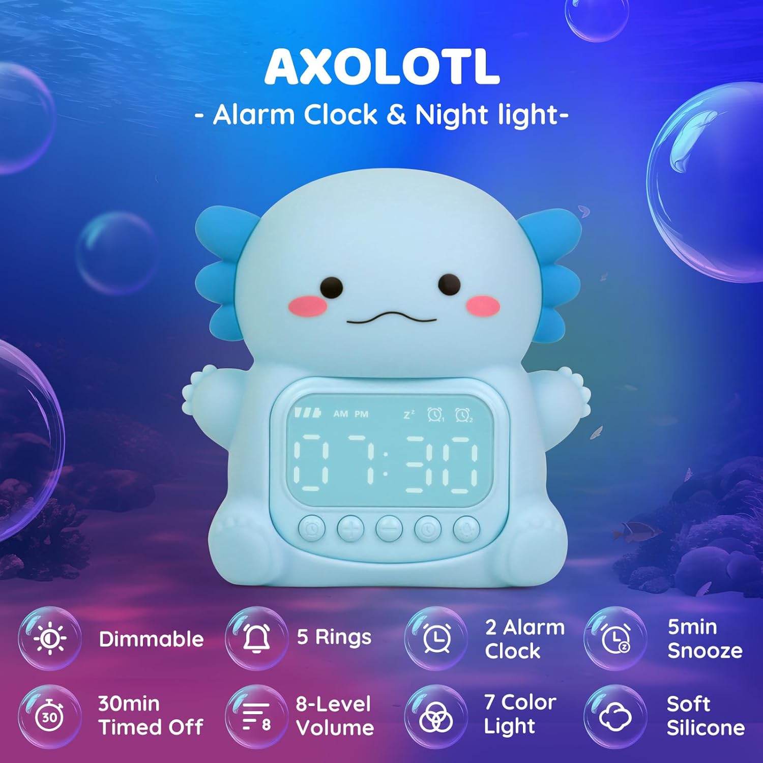 Axolotl Alarm Clock with Night Light for Kids, Rechargeable Silicone Lamp Time to Wake Clock Cute Animal Tabletop Lamp, Perfect Sleep Companion for Boys Girls, Blue