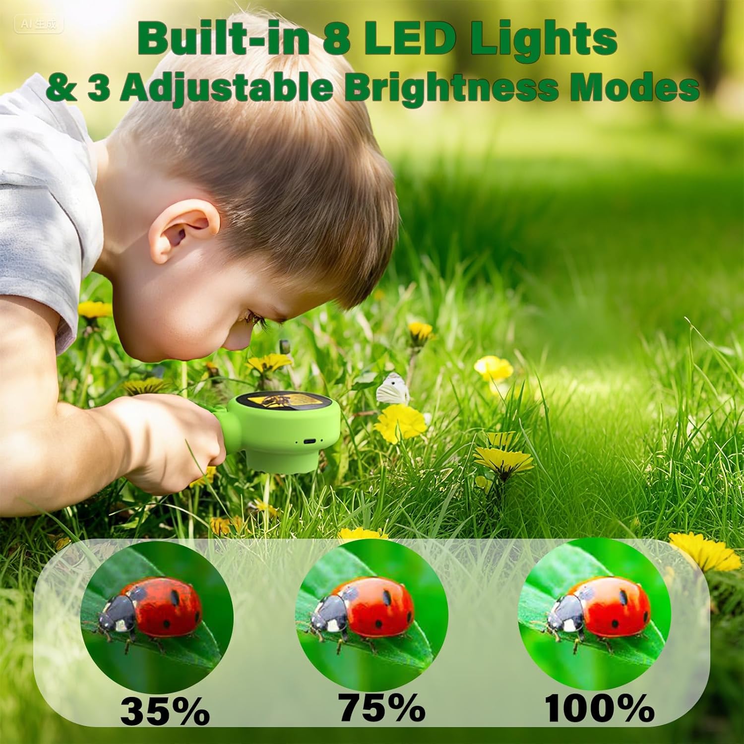 - 【Ergonomic & Kid-Friendly Design】Ultra-lightweight and shaped for small hands, this portable microscope is easy to hold and carry. Built-in 8 LED lights, with three adjustable brightness modes, clear viewing in daylight or darkness, perfect for indoor experiments or outdoor exploration