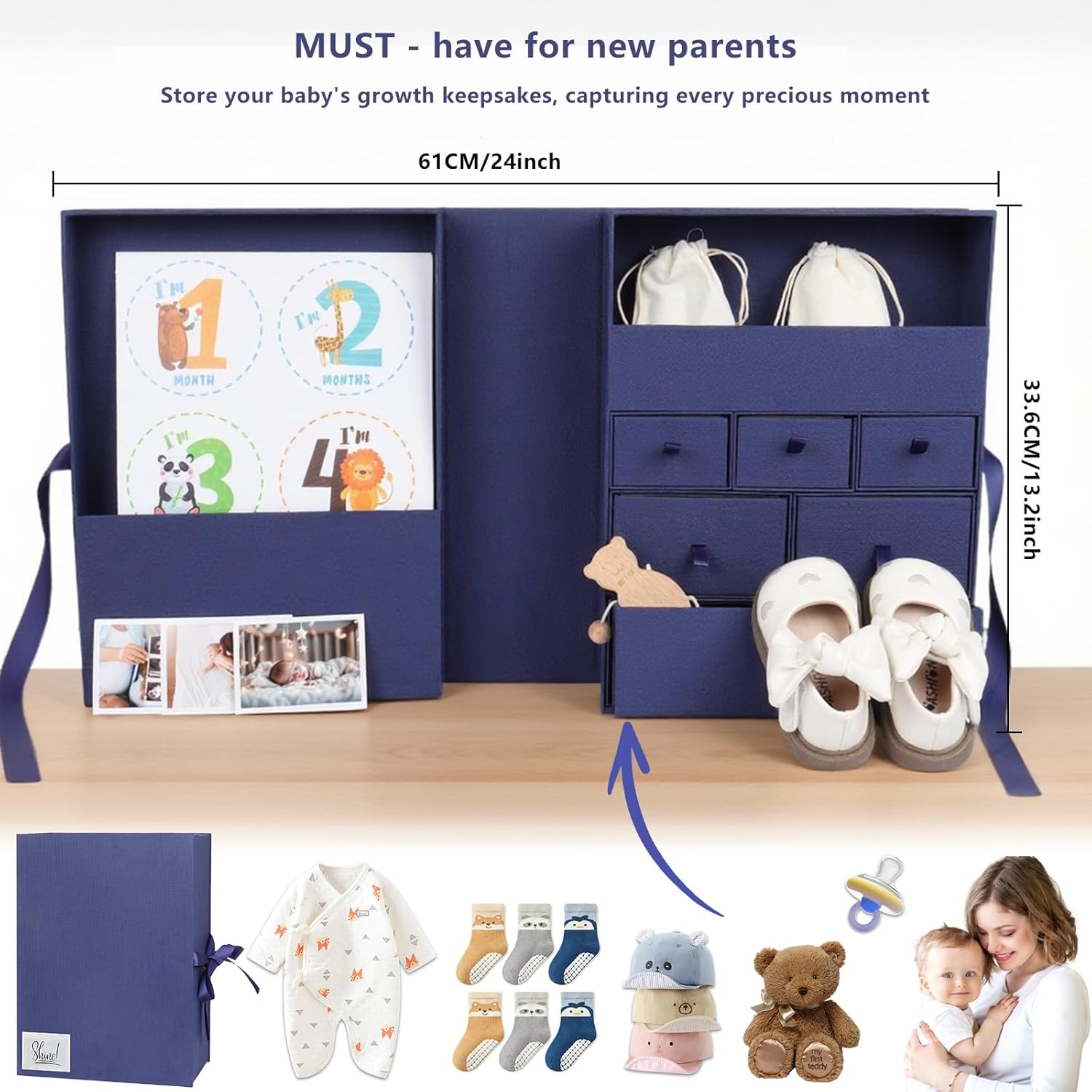 Memory Box for Kids,Baby Keepsake Box, Large Memory Box Drawer-Style Design with 8 Additional Items,Newborn Keepsake Box for Baby Girl & Boy,Gift for Baby Shower, Expecting Moms (Blue)