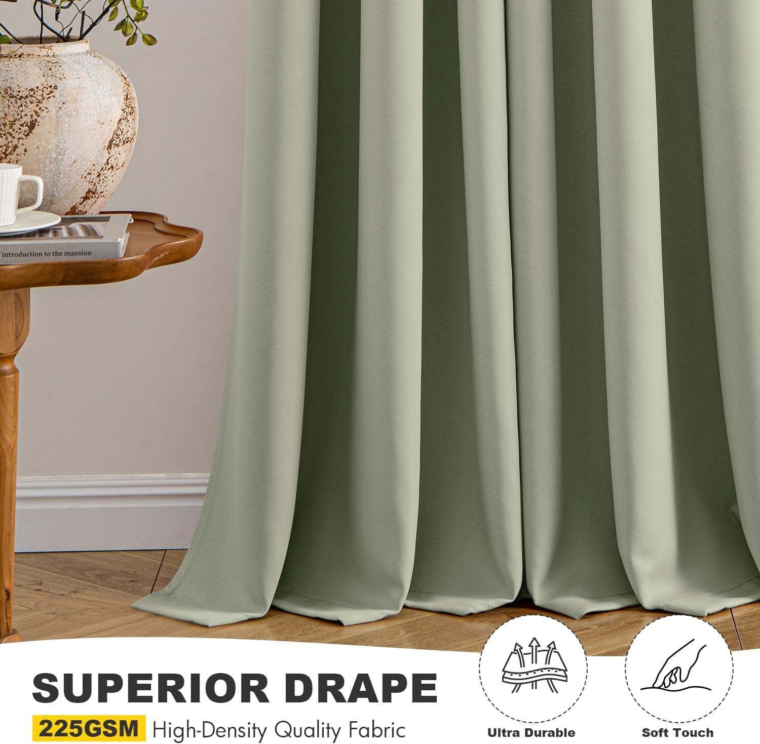 - High-Quality Material: Crafted from high-quality 225GSM polyester fabric, these curtains offer enhanced durability and elegant drape. The soft blackout material features triple-layer weaving technology, with a middle layer of black yarn for superior light blocking and privacy. Both sides feature the same refined color, ensuring a seamless look that elevates your home’s aesthetic with understated sophistication