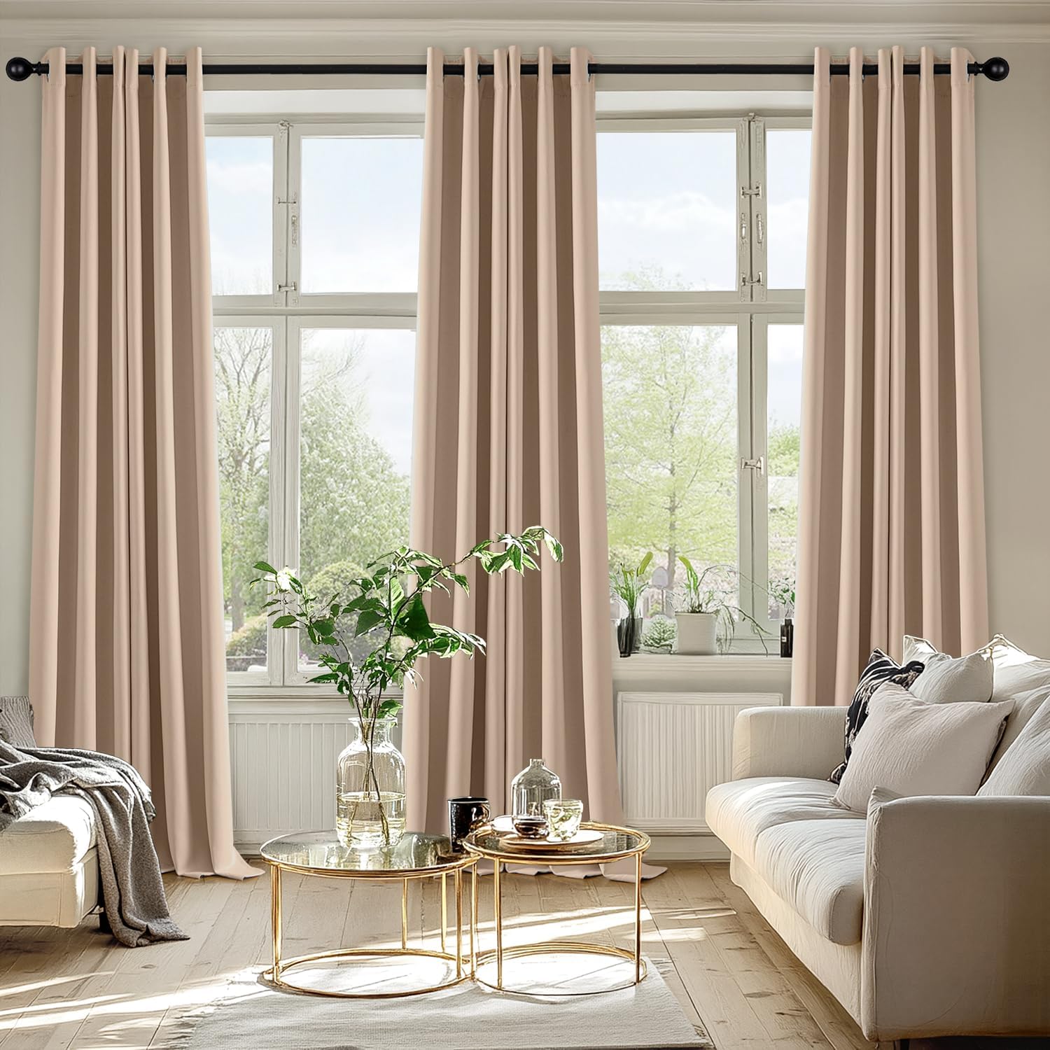 - High-Quality Material: Crafted from high-quality 225GSM polyester fabric, these curtains offer enhanced durability and elegant drape. The soft blackout material features triple-layer weaving technology, with a middle layer of black yarn for superior light blocking and privacy. Both sides feature the same refined color, ensuring a seamless look that elevates your home’s aesthetic with understated sophistication