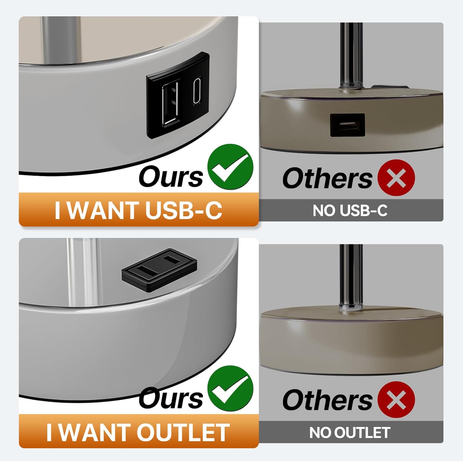- ❤️【USB A+C charging Ports & AC Outlet】―Besides illumination, this modern table lamp for bedroom is euipped with USB A &USB C (5V/2.1A), and AC outlet (120V) for fast charging, getting your phones, tablets, humidifier, kindle, headsets, speaker and other electronics fully charged no matter if the side table lamp is on or off.