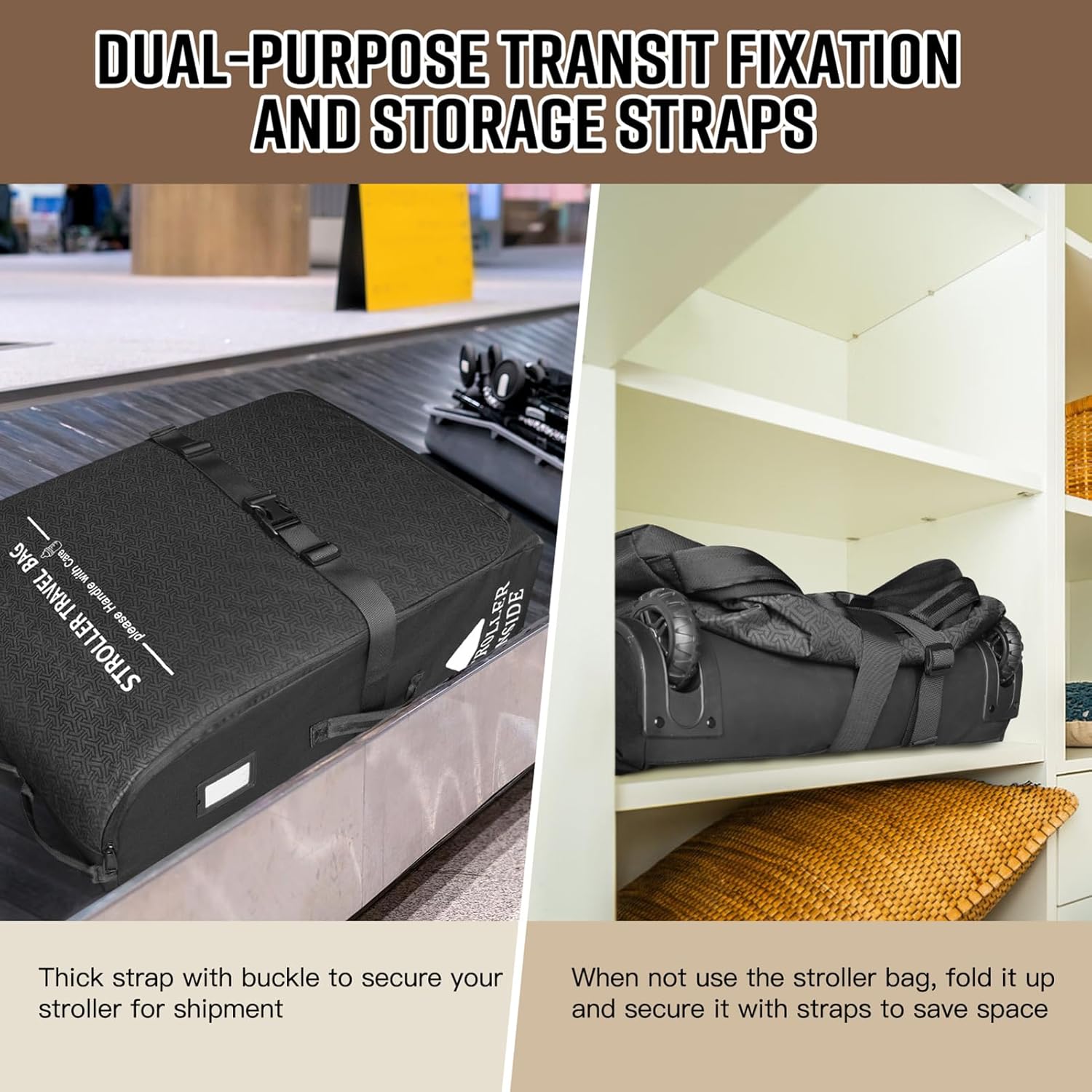 - ULTIMATE PROCTECTION: Designed with 3 layers of premium luggage grade materials,our baby stroller travel bag ensures all-around protection against bumps, scratches, and even light rain. The interior fixing strap ensure your stroller doesn't wobble inside, and an adjustable luggage packing strap(2” wide) to secure the entire travel bag in pristine condition.