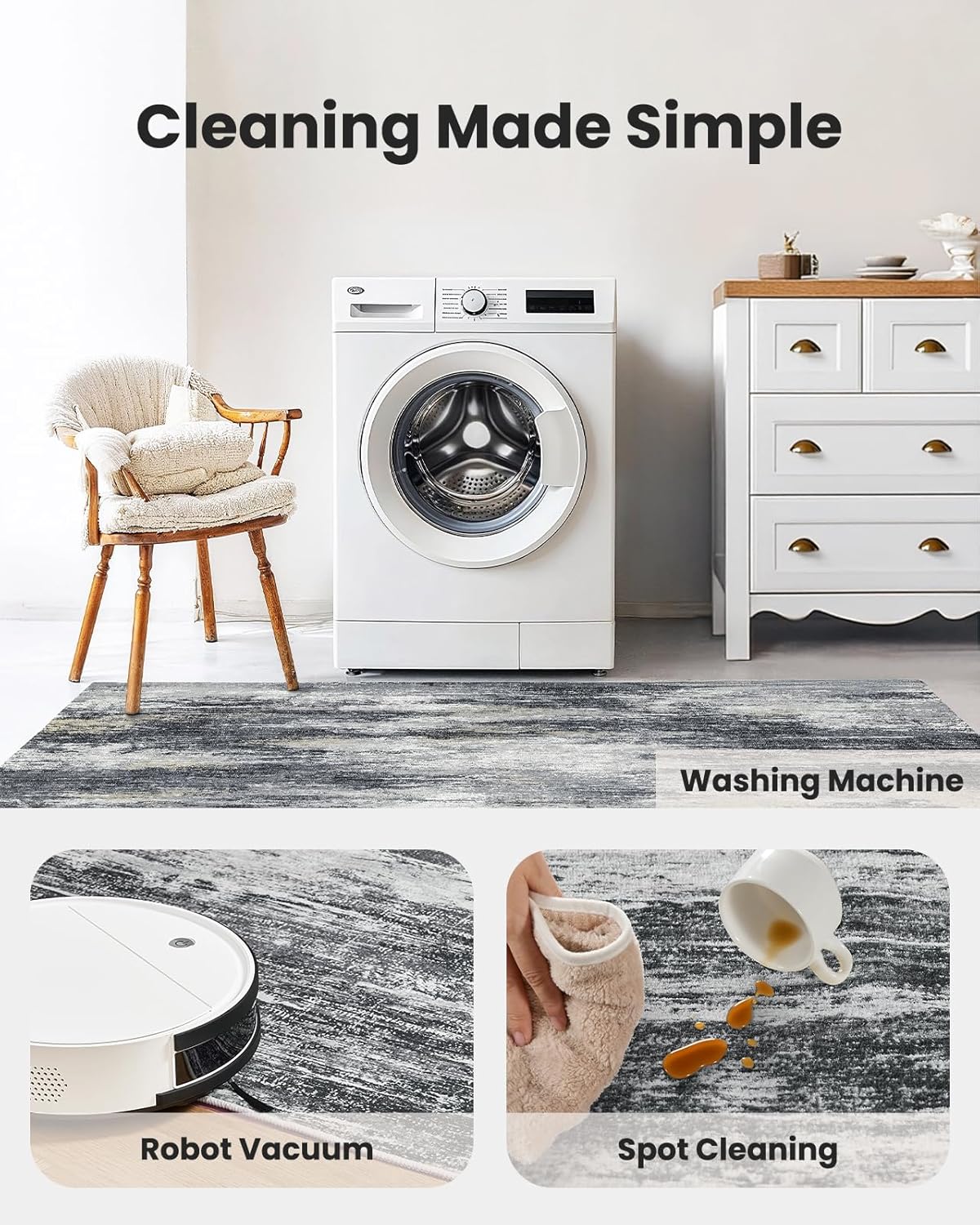 - 【Durable and Easy to Clean】This living room rug features a 0.24″ low-pile design with double-stitched edges for durability and easy maintenance. It’s easy to clean with a standard vacuum or robotic vacuum. For a deeper clean, this rug is machine washable. Ideal for high-traffic areas.