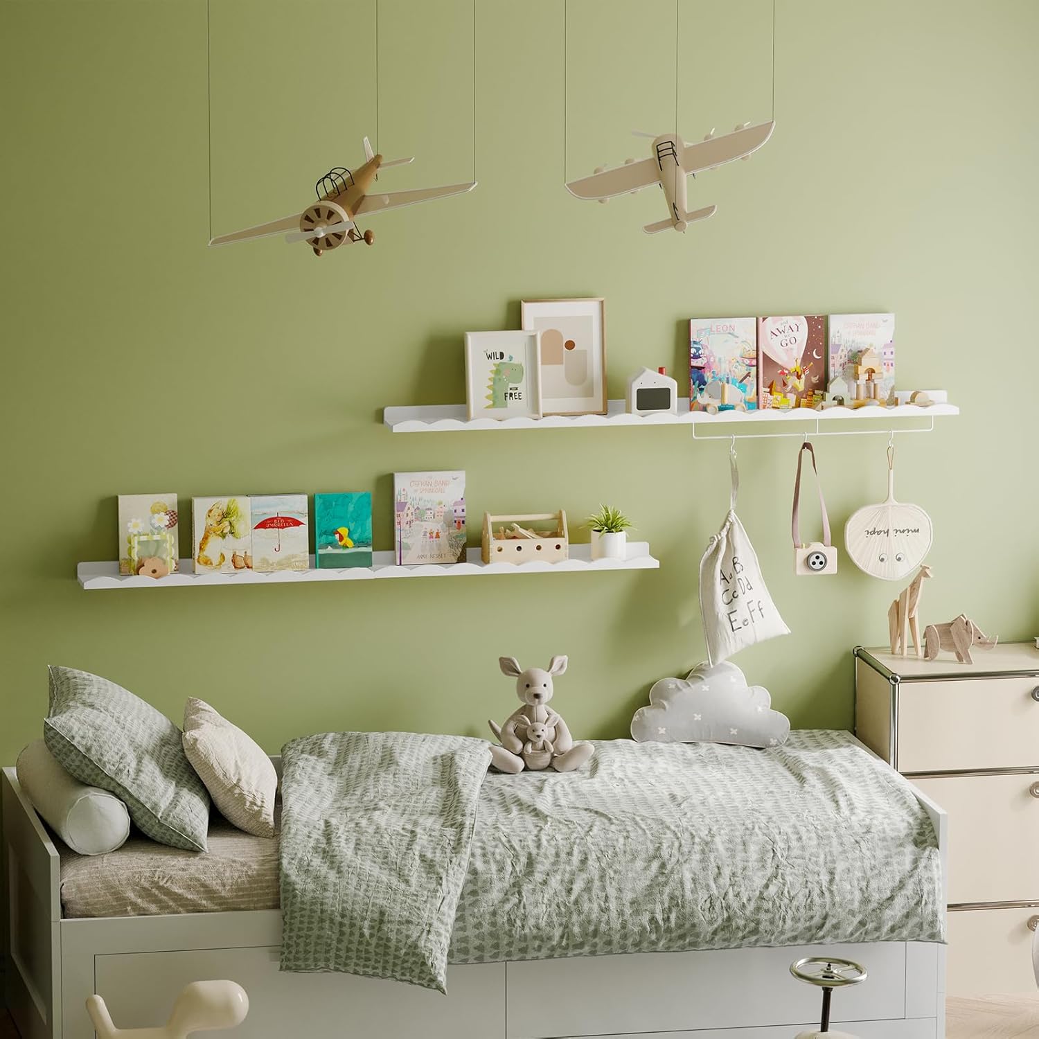 - 【Natural Wood & Anti-Crash Design】Our nursery shelves are Made of long-lasting solid pine wood, these floating book shelves are built to last and provide a reliable storage solution for your children's favorite items. With smooth edges and anti-crash design, this bookshelf not only organizes your child's books and toys but also adds a touch of safty and creativity to their space.
